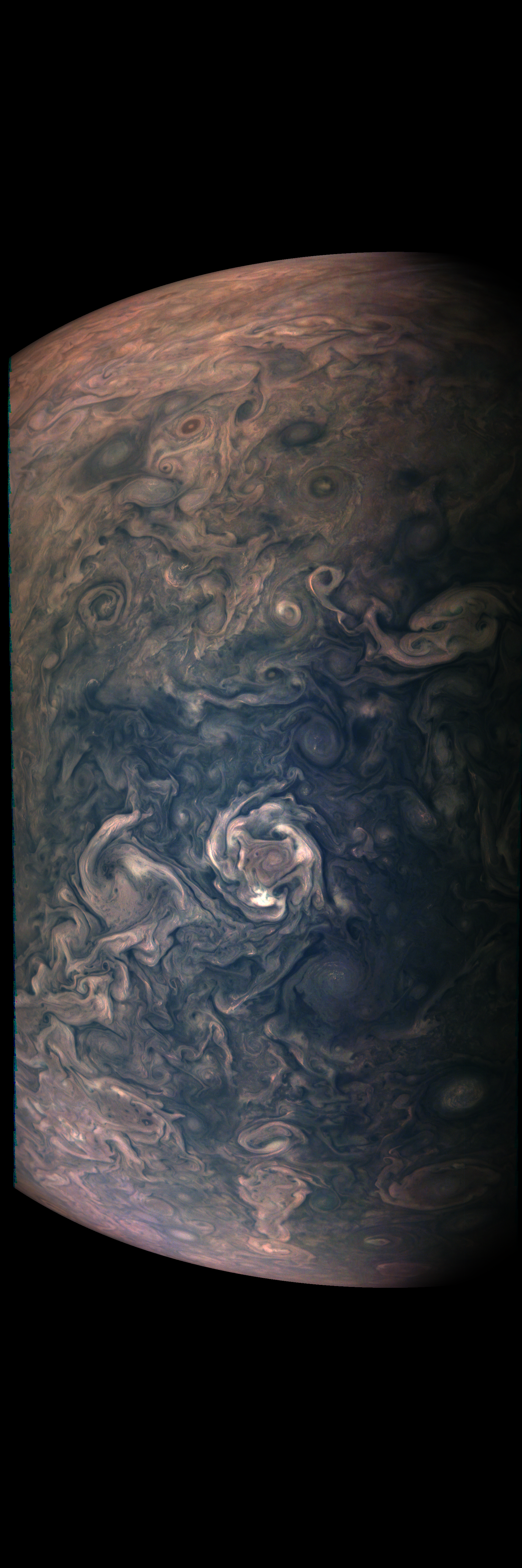 Junocam pixels are 12 bits deep from the camera but are converted to 8 bits inside the instrument using a lossless "companding" table, a process similar to gamma correction, to reduce their size. All Junocam products on the missionjuno website are in this 8-bit form as received on Earth. Scientific users interested in radiometric analysis should use the "RDR" data products archived with the Planetary Data System, which have been converted back to a linear 12-bit scale.