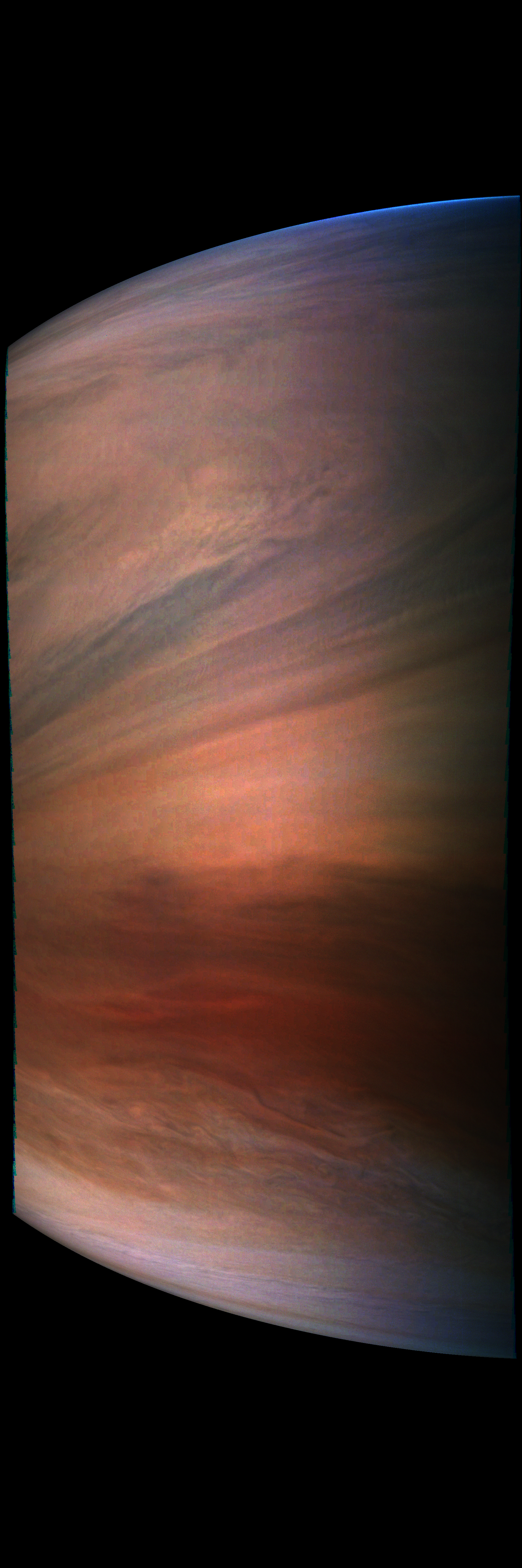 Junocam pixels are 12 bits deep from the camera but are converted to 8 bits inside the instrument using a lossless "companding" table, a process similar to gamma correction, to reduce their size. All Junocam products on the missionjuno website are in this 8-bit form as received on Earth. Scientific users interested in radiometric analysis should use the "RDR" data products archived with the Planetary Data System, which have been converted back to a linear 12-bit scale.