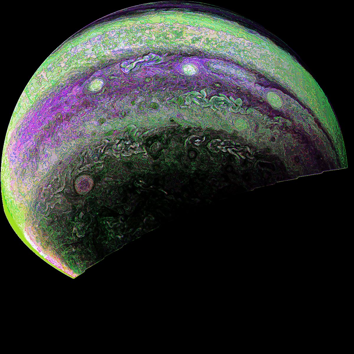 We invite you to download raw JunoCam images posted here and do your own image processing on them. Be creative! Anything from cropping to color enhancing to collaging is fair game. Then upload your creations here.