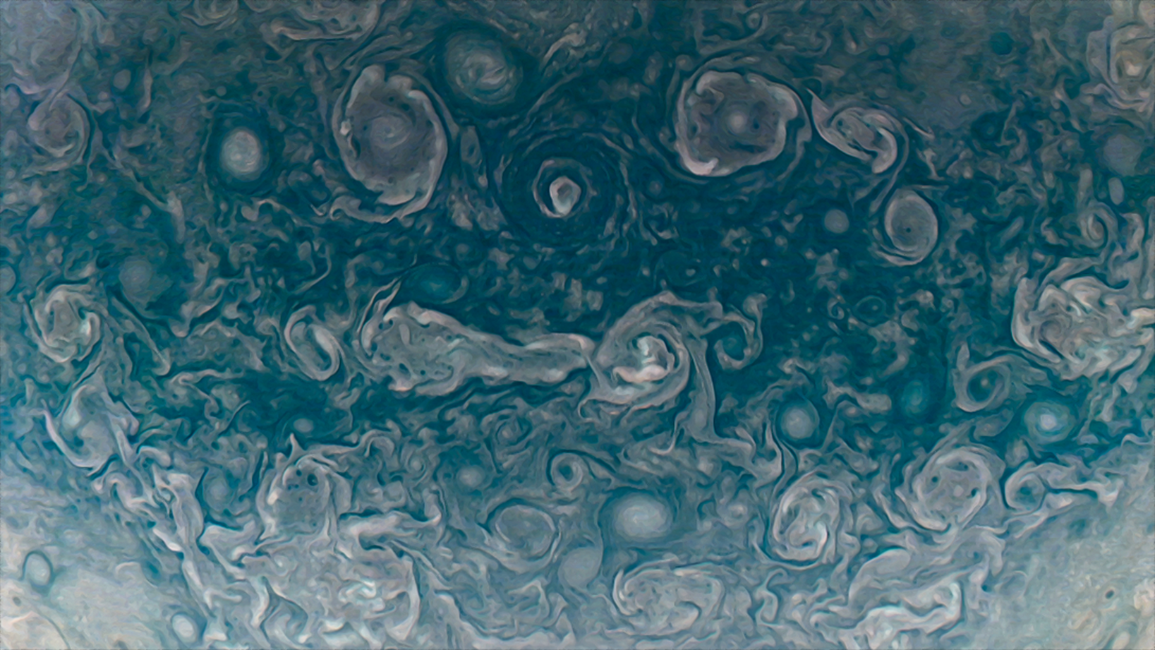 Processed using the JunoCam imager's PJ44 North Pole at Minimum Emission Angle raw images and data from NASA's Juno spacecraft flyby on August 17, 2022. Enhanced to highlight features, clouds, colours, and the beauty of Jupiter. Artist's impression - not representative of true colour.