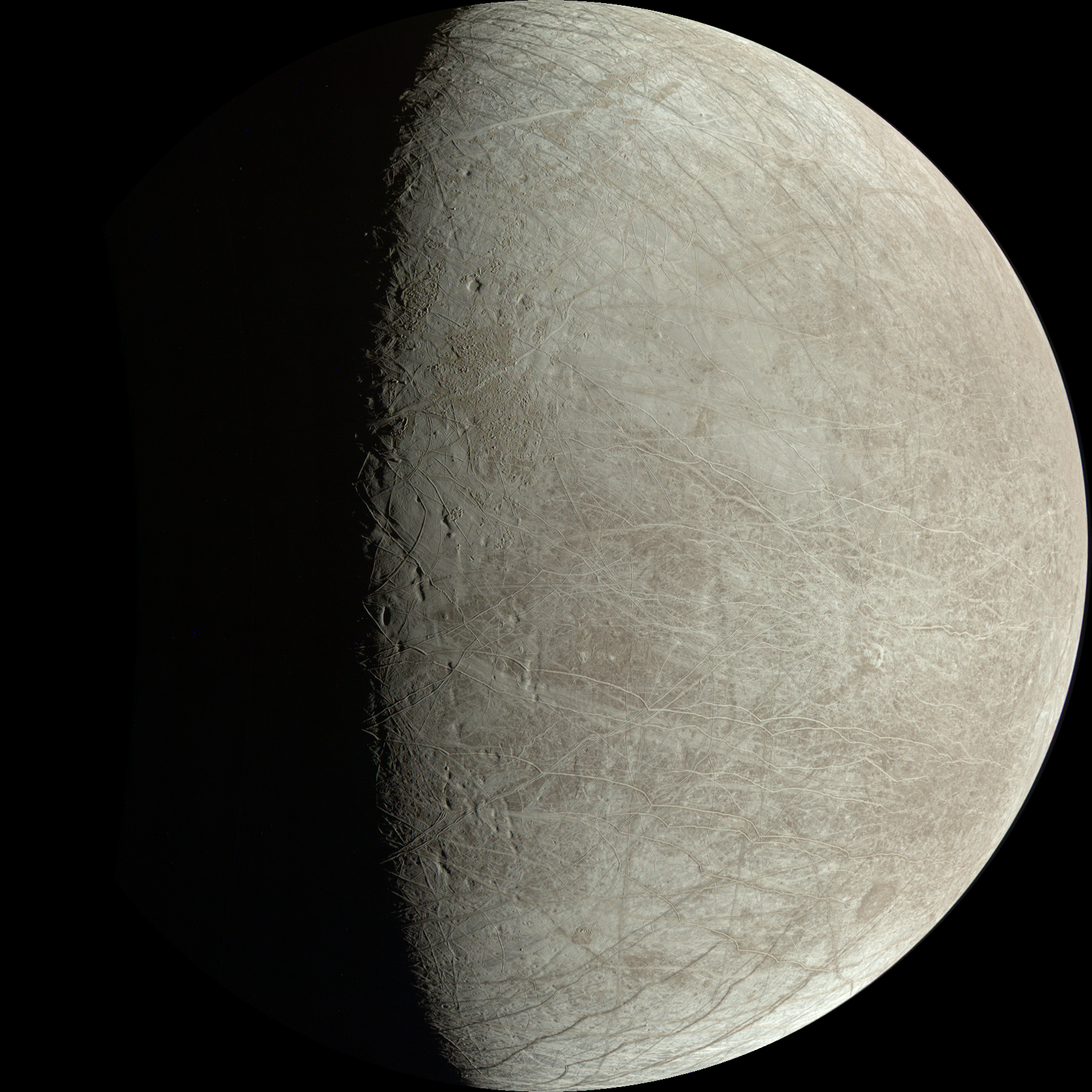Geometrically controlled mosaic of Europa from Juno's Perijove 45. Pixel scale is 1008 meters per pixel and this view is centered at 11.7 N, 0.6 W.