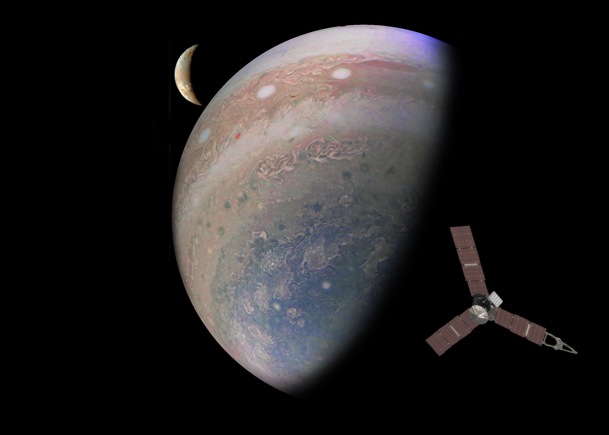 Jupiter Image from JunoCam. Images of Io and Juno superimposed.