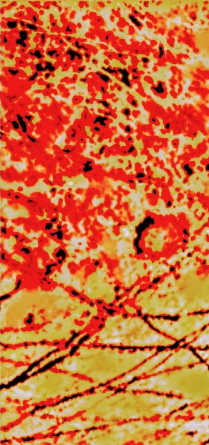 This is a JunoCam image of the scratches and pit on Europa. This is an artisistic heat image showing the heat in the cracks on the surface due to a possible cutting of the surface or a bio/waste material in the cracks. This photo process was dobe by Center Of Astronomical Research. This is a digital image. No false coloring was added to the image only enhancemebts if the natural colors and elements present