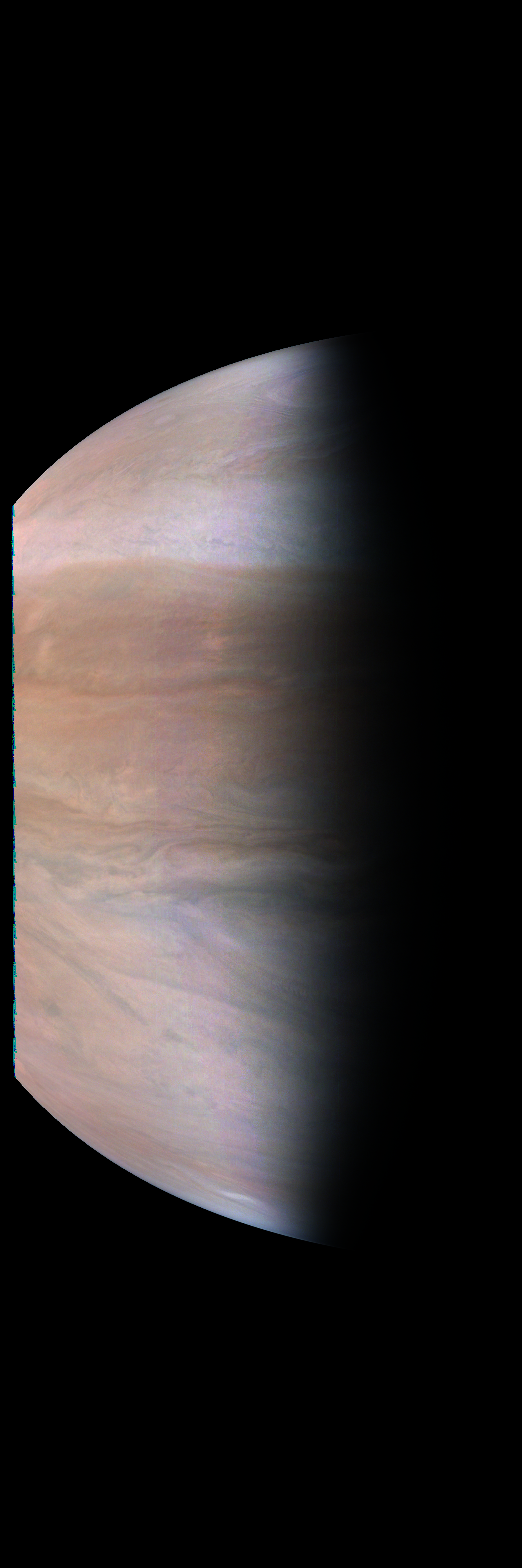 Resolution is 30 pixels per degrees in an equidistant cylindrical system centered to the camera at image stop time, with an axis parallel to Juno's spin axis. The rendered field of view is 60x180 degrees.