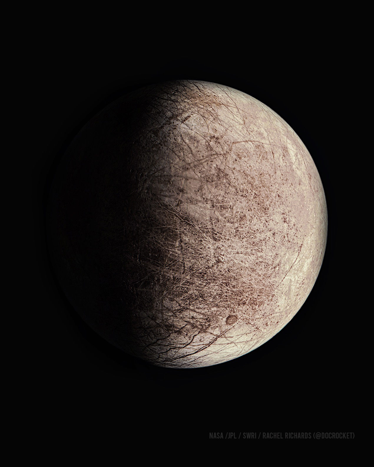 Europa as captured by Juno spacecraft on September 29, 2022 during mission phase PERIJOVE 45. Image processed by Rachel Richards.
