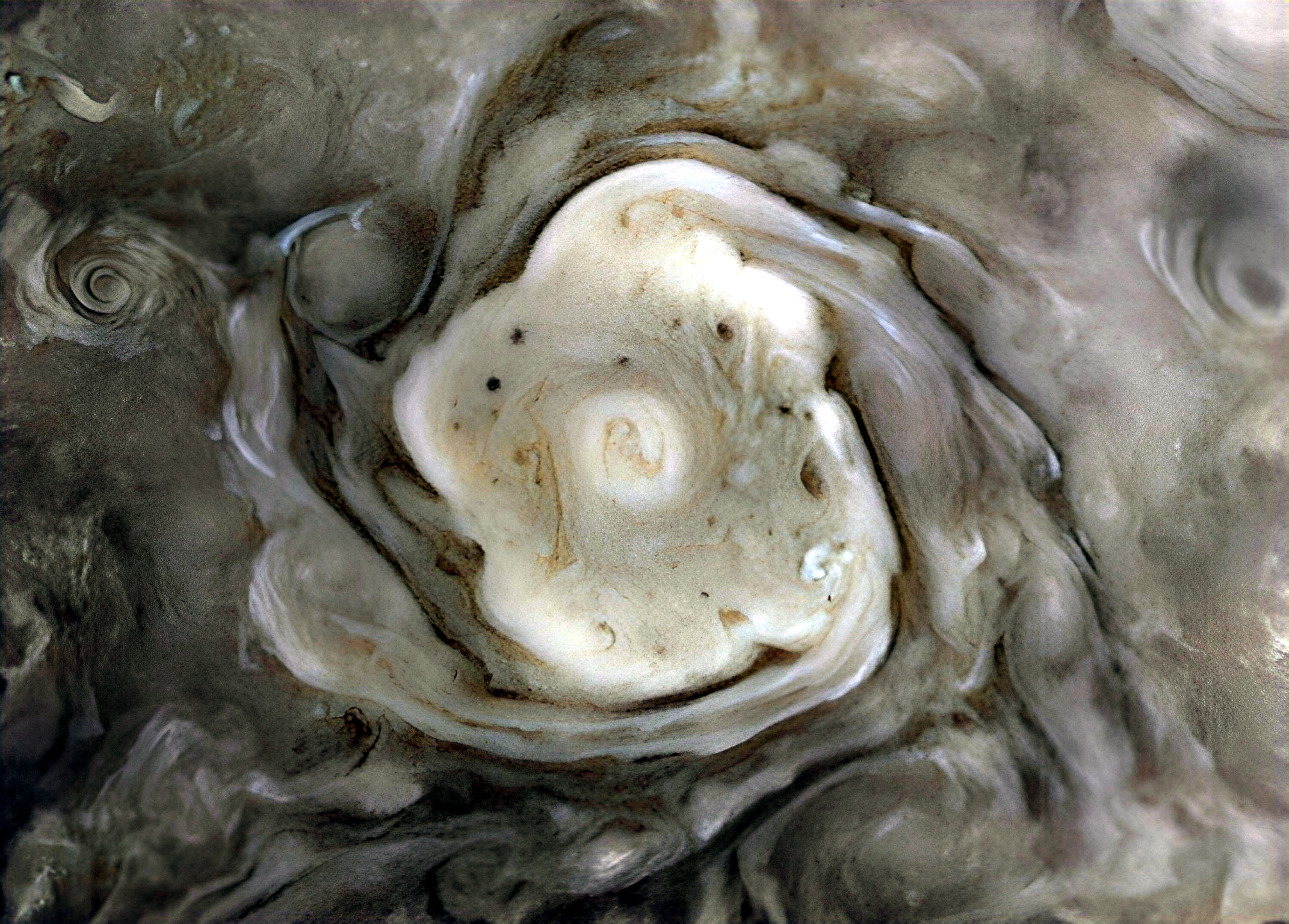 The highly exaggerated and enhanced image of a circumpolar cyclone captured by Junocam on its 43rd Perijove on July 5th, 2022. Note that the colors in the image are not representative of the actual colors.
