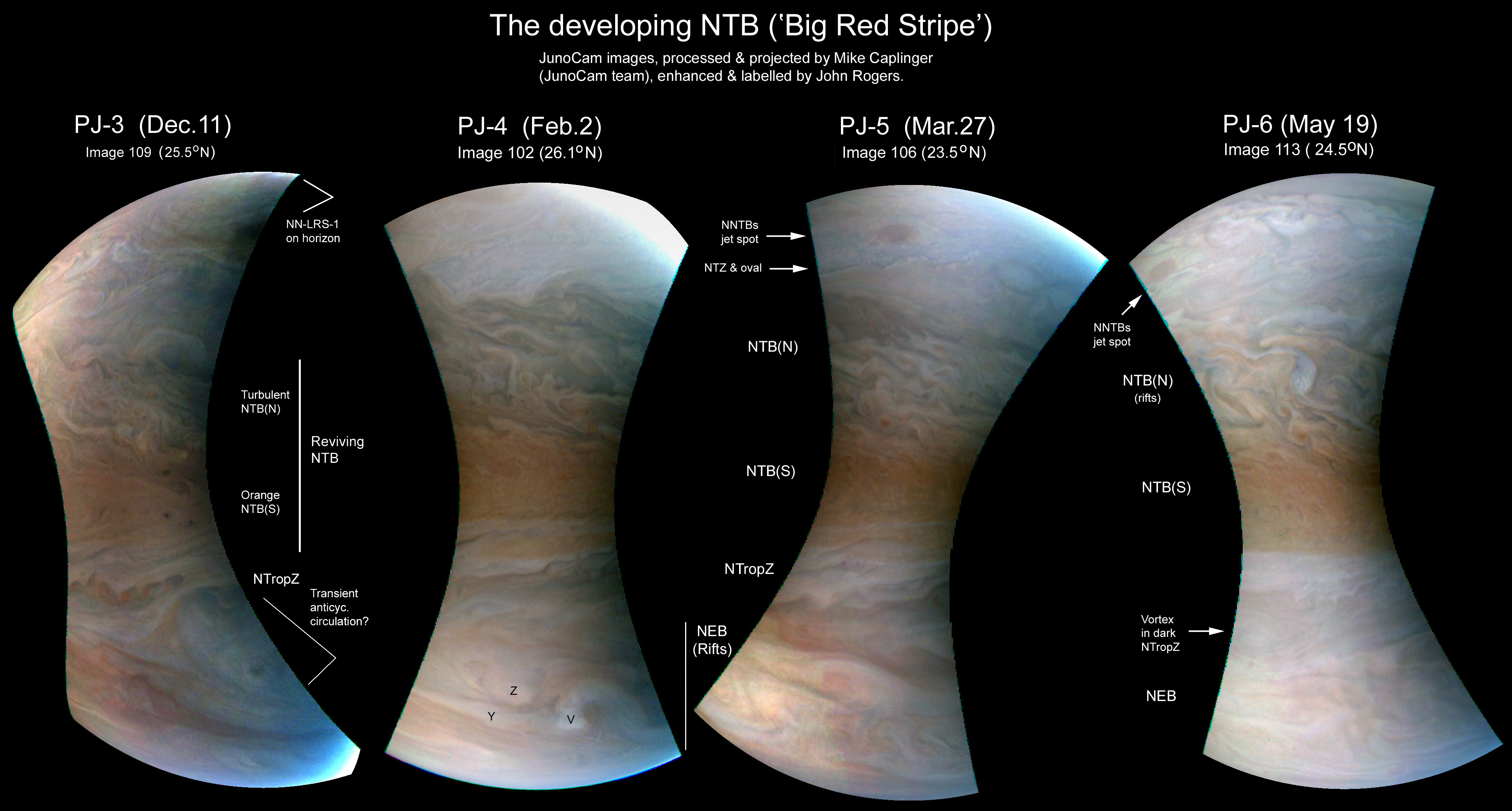 The NTB has been reviving in classic manner since the great outbreak in autumn 2016, and JunoCam has repeatedly targeted the “Big Red Stripe” (the reviving orange NTB(S)) to follow this process. Further description is at: https://britastro.org/node/10478. –John Rogers.