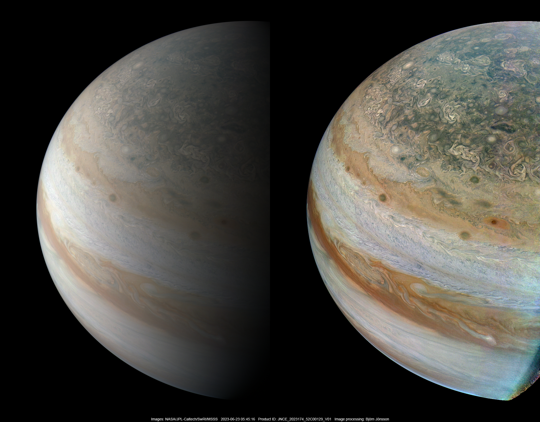 Two versions of image PJ52_129 showing Jupiter's northern hemisphere: An approximately true color/contrast version (left) and a heavily processed enhanced version (right). North is up.