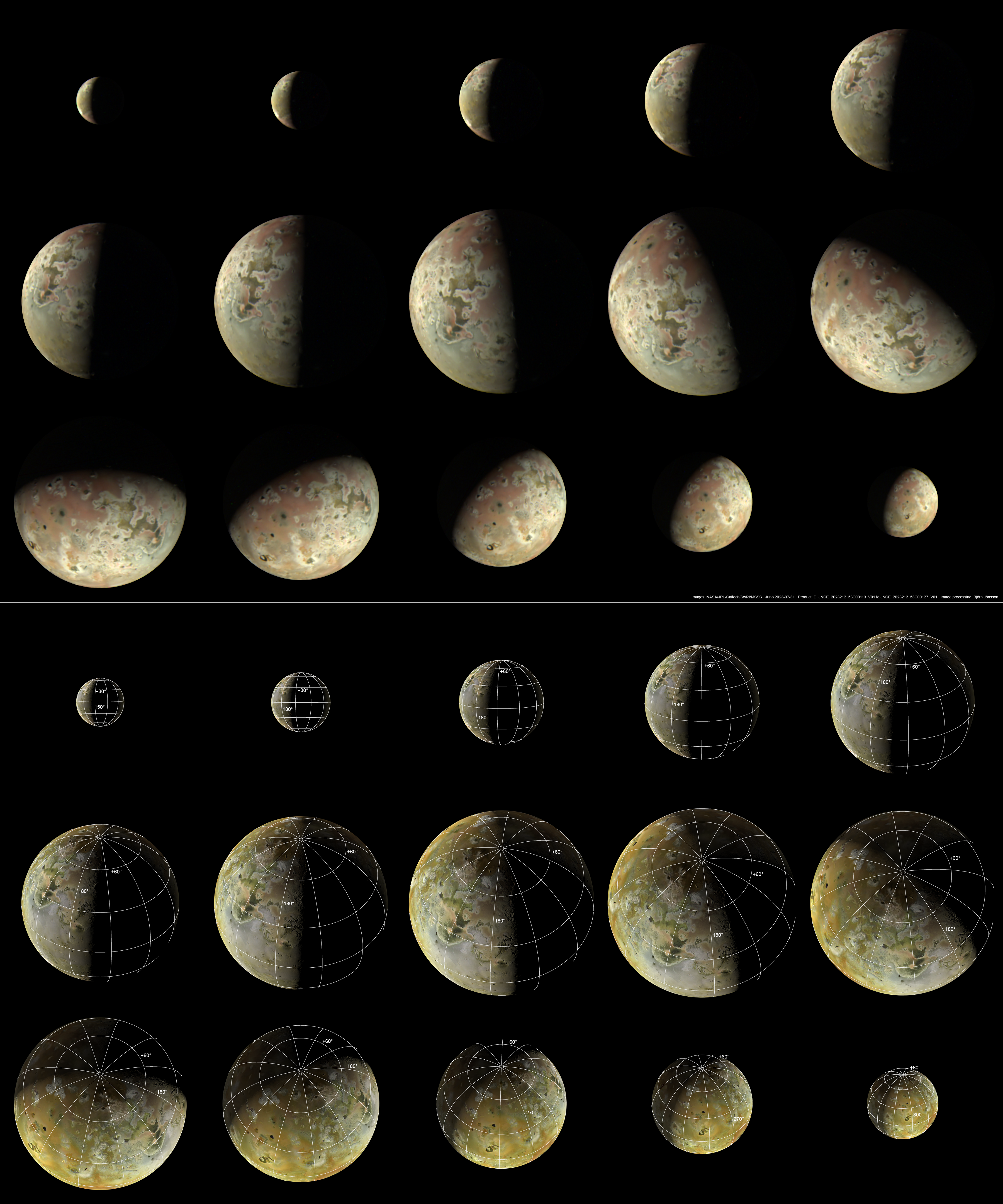 A montage of 15 of the PJ53 JunoCam images of Io. North is up in all of the images. The color balance is preliminary but hopefully this is not very far from Io's real color. The images are enlarged by a factor of 3 relative to the original data.