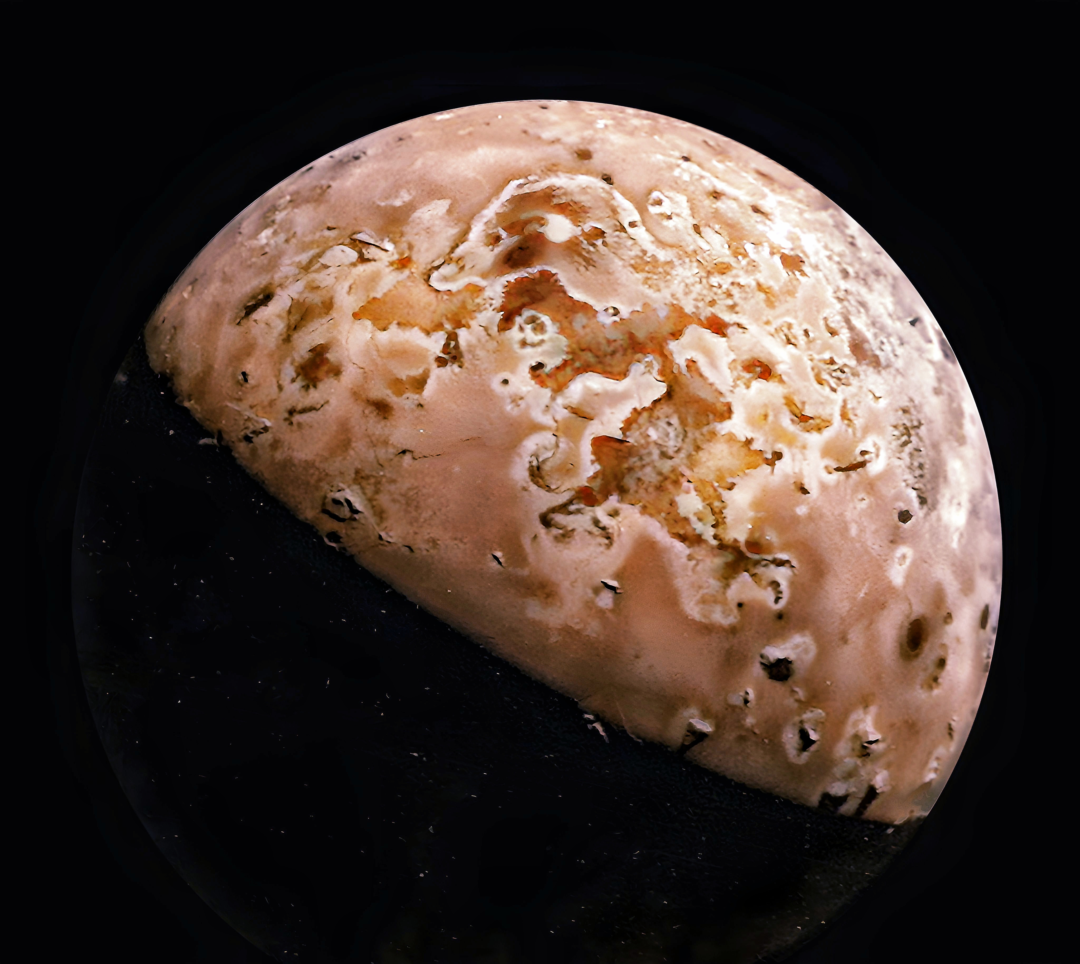 An image of IO rendered in enhanced false color, generated from the raw data captured by JunoCam on October 15, 2023