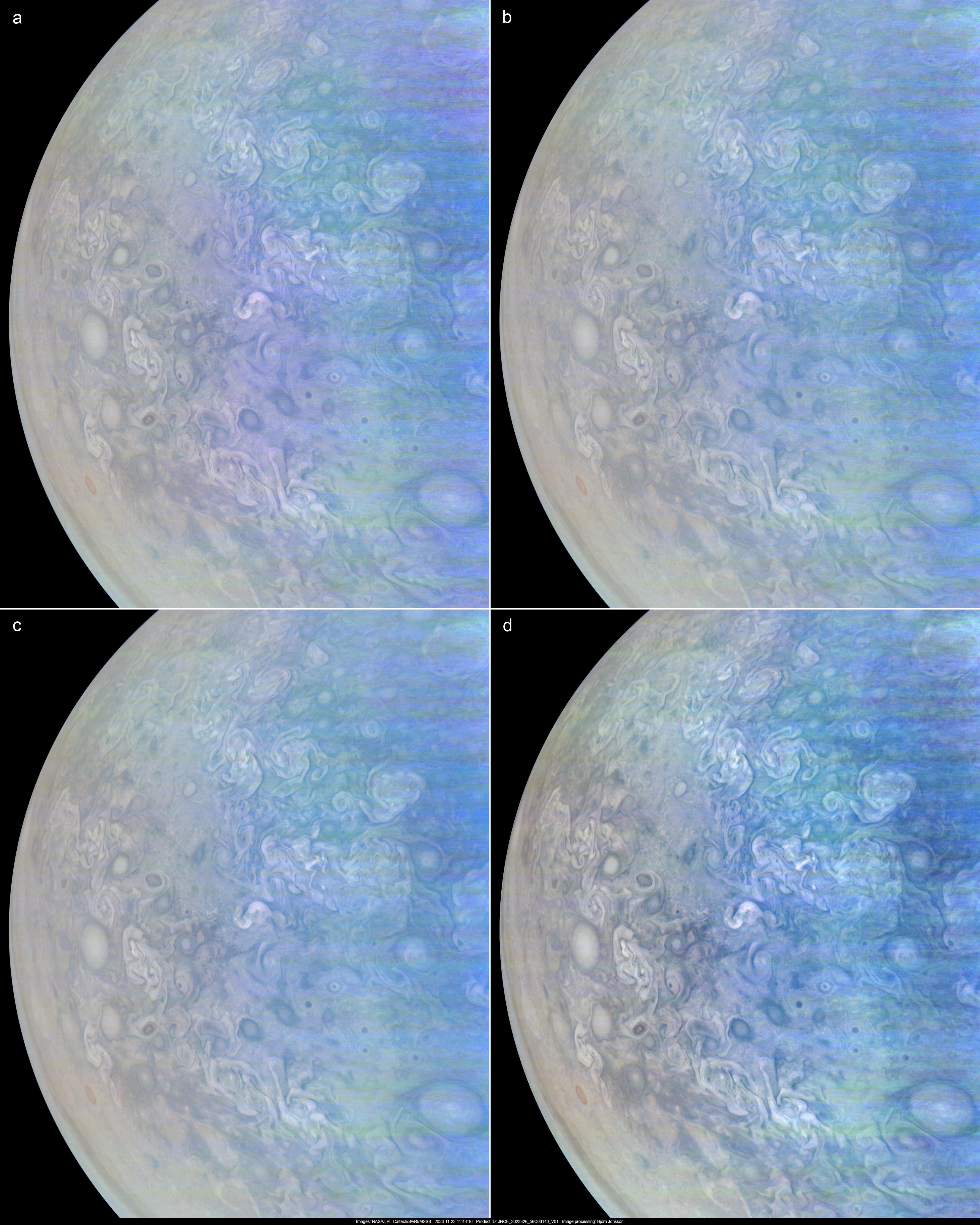 This montage shows image PJ56_140 at several different processing levels. The perijove 56 images are significantly more difficult to process than earlier images due to horizontal 'striping' and greatly increased background noise. In this image, the blue channel is almost useless in the darkest areas at right. However, the quality of the red channel data is remarkably high.