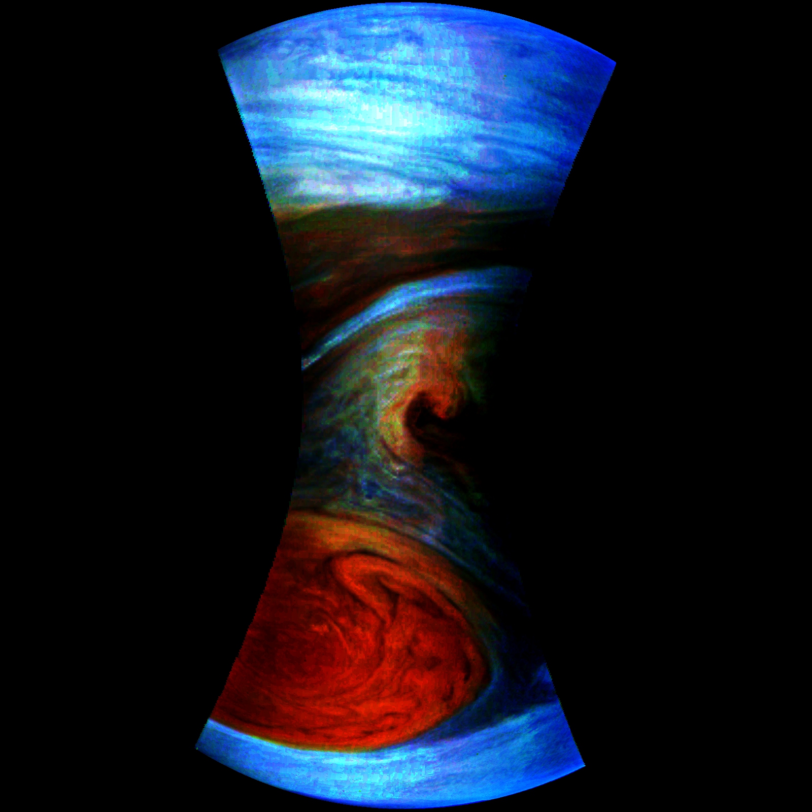Junocam pixels are 12 bits deep from the camera but are converted to 8 bits inside the instrument using a lossless "companding" table, a process similar to gamma correction, to reduce their size. All Junocam products on the missionjuno website are in this 8-bit form as received on Earth. Scientific users interested in radiometric analysis should use the "RDR" data products archived with the Planetary Data System, which have been converted back to a linear 12-bit scale.