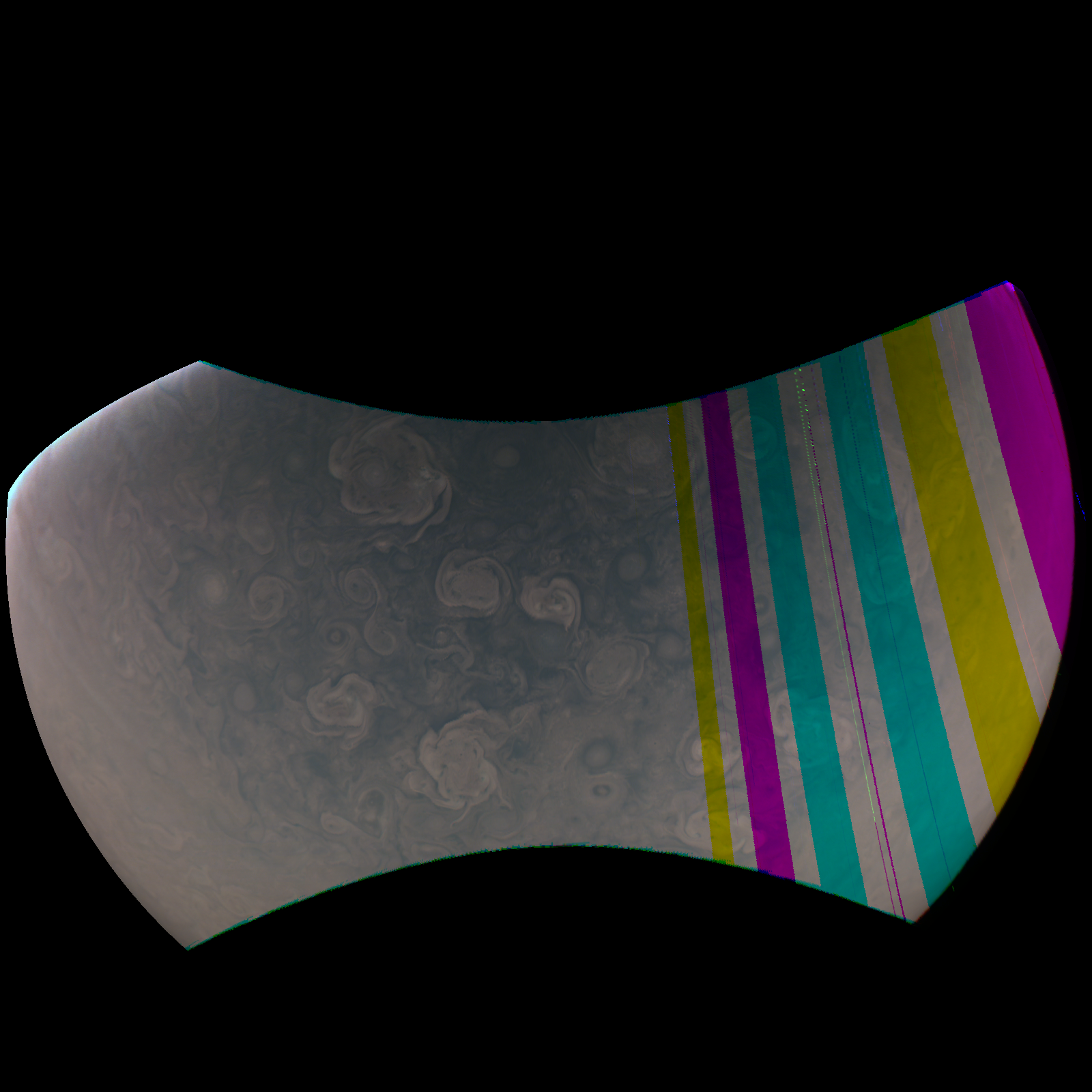 Junocam pixels are 12 bits deep from the camera but are converted to 8 bits inside the instrument using a lossless "companding" table, a process similar to gamma correction, to reduce their size. All Junocam products on the missionjuno website are in this 8-bit form as received on Earth. Scientific users interested in radiometric analysis should use the "RDR" data products archived with the Planetary Data System, which have been converted back to a linear 12-bit scale.