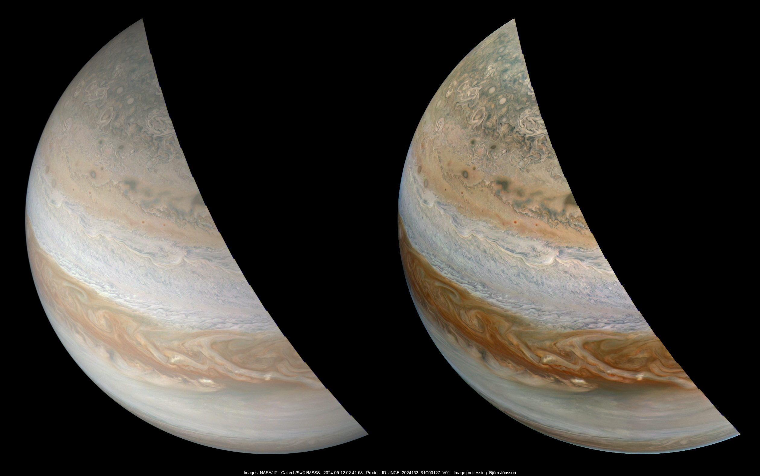 Two versions of image PJ61_127 showing Jupiter's northern hemisphere: An approximately true color/contrast version (left) and a heavily processed enhanced version (right). North is up.