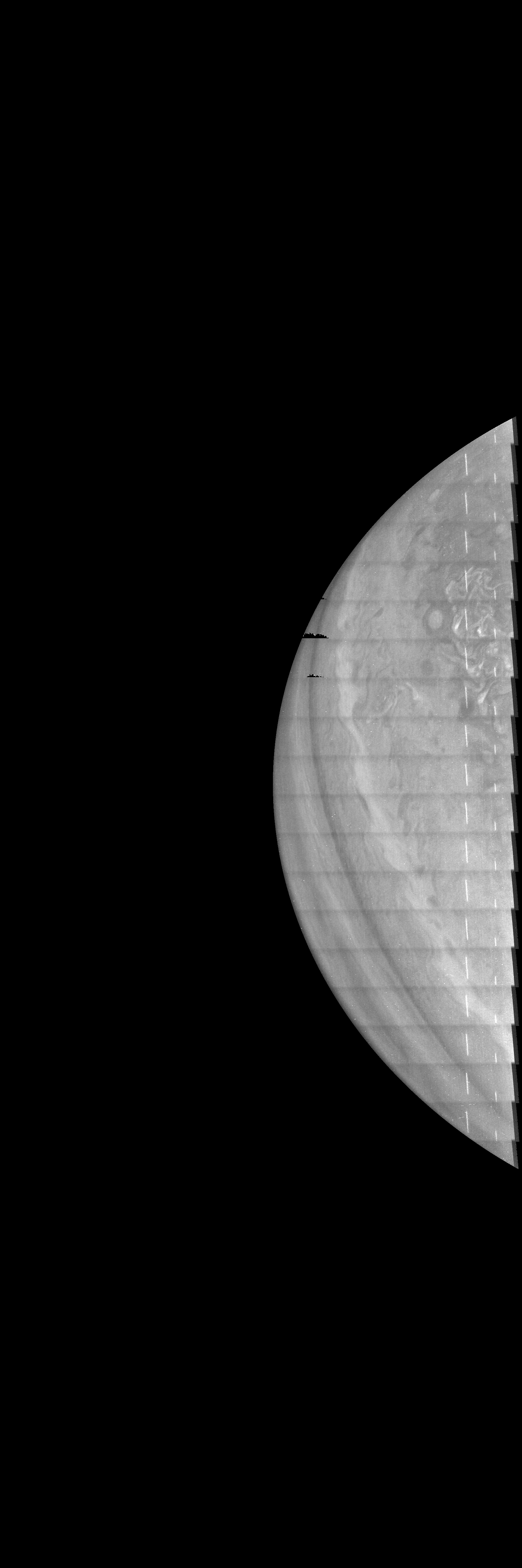 Resolution is 30 pixels per degree in an equidistant cylindrical frame centered to the camera at image stop time, with an axis parallel to Juno's spin axis. The rendered field of view is 60x180 degrees.