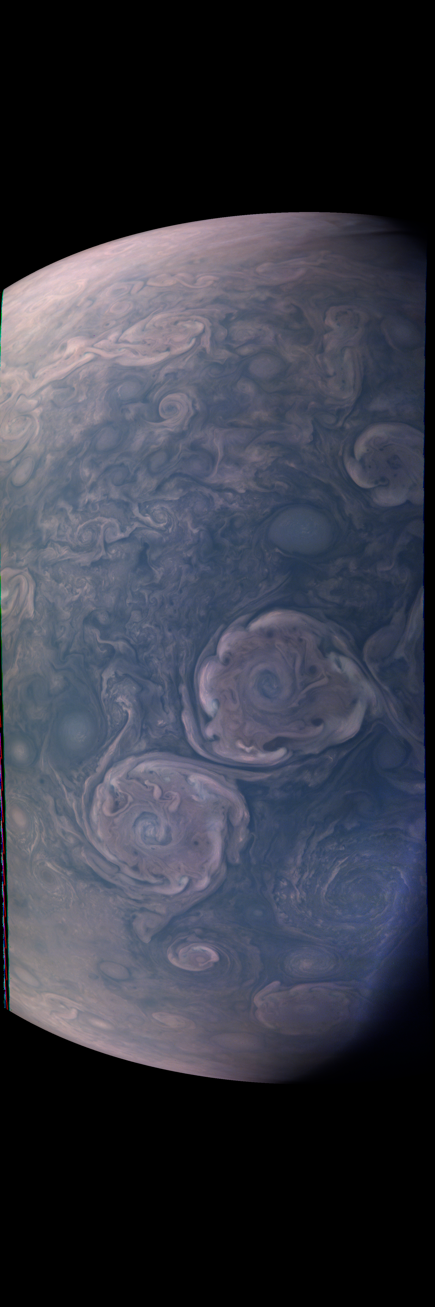 The image is reprojected according to a preliminary geometrical camera model, cleaned from some of the camera artifacts, approximately illumination adjusted with a 3rd degree polynomial BRDF over the cosines of the incidence and emission angle on the basis of PJ50 images, linearized to radiometric values, white-balanced with linear factors (0.629;1.0;3.65) for (R;G;B) on the basis of inbound PJ63 JunoCam images, and displayed with gamma=2 with respect to the square root of radiometric values.