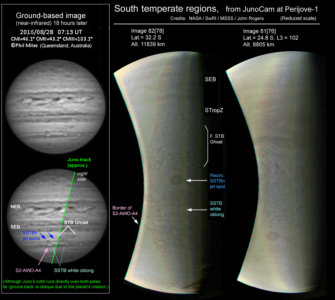 These two images captured either the following (west) end of the STB Ghost or, more likely, the region immediately following it. The whole region seems to be exceptionally turbulent. The Ghost is a cyclonic circulation, and on its south side, spots arriving on the prograde S2 (SSTBn) jet recirculate to return in the opposite direction. One such spot can be seen here, and it appears to be a vortex. (These two images are not of high quality, because their titles indicate that they were intended for ‘compression comparison’ – i.e. testing the effect of reducing file sizes for transmission. Here they are shown at half size.)