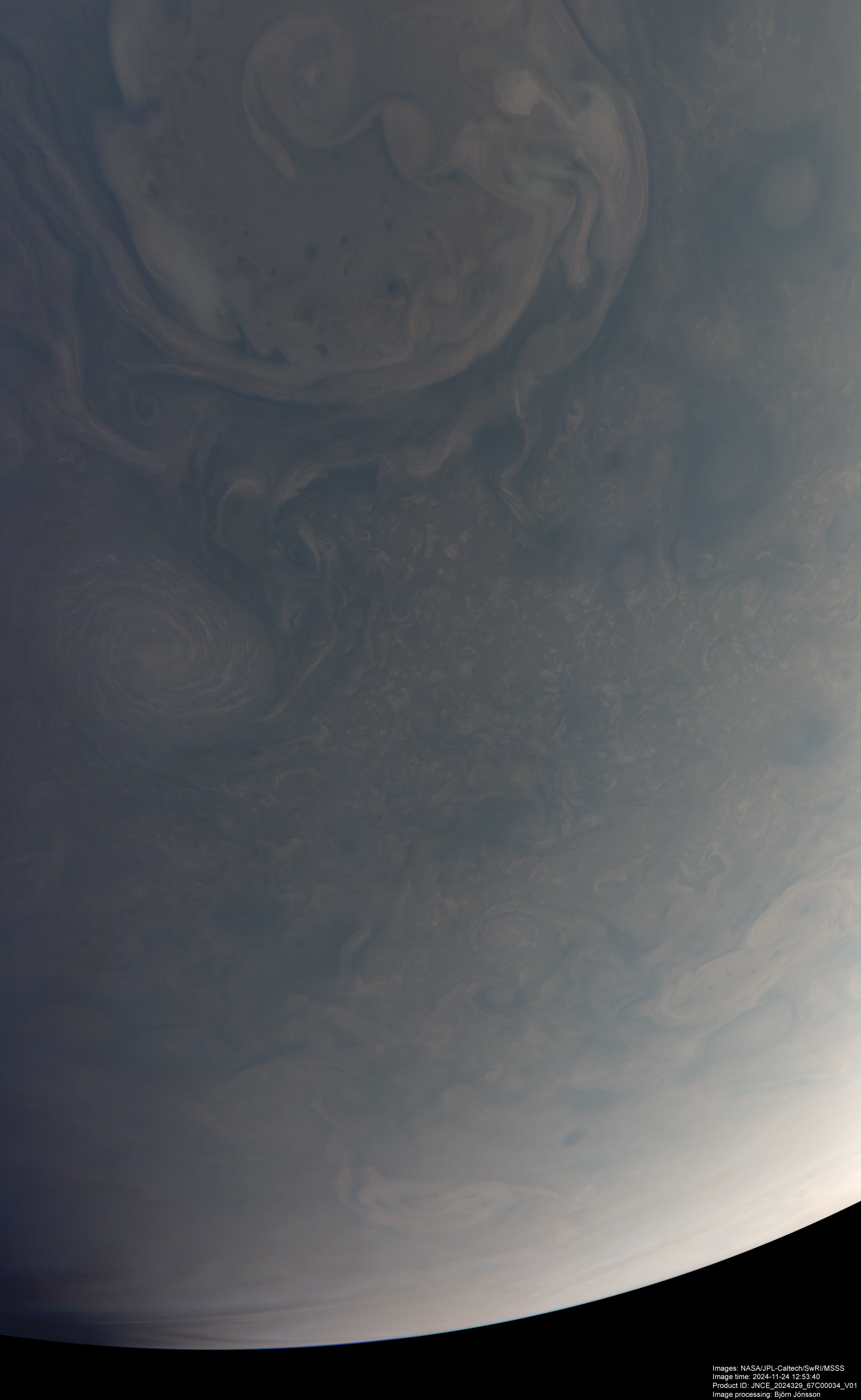 An approximately true color/contrast image processed from the PJ67_34 raw image framelets. The area near the terminator has been brightened a bit. North is up.