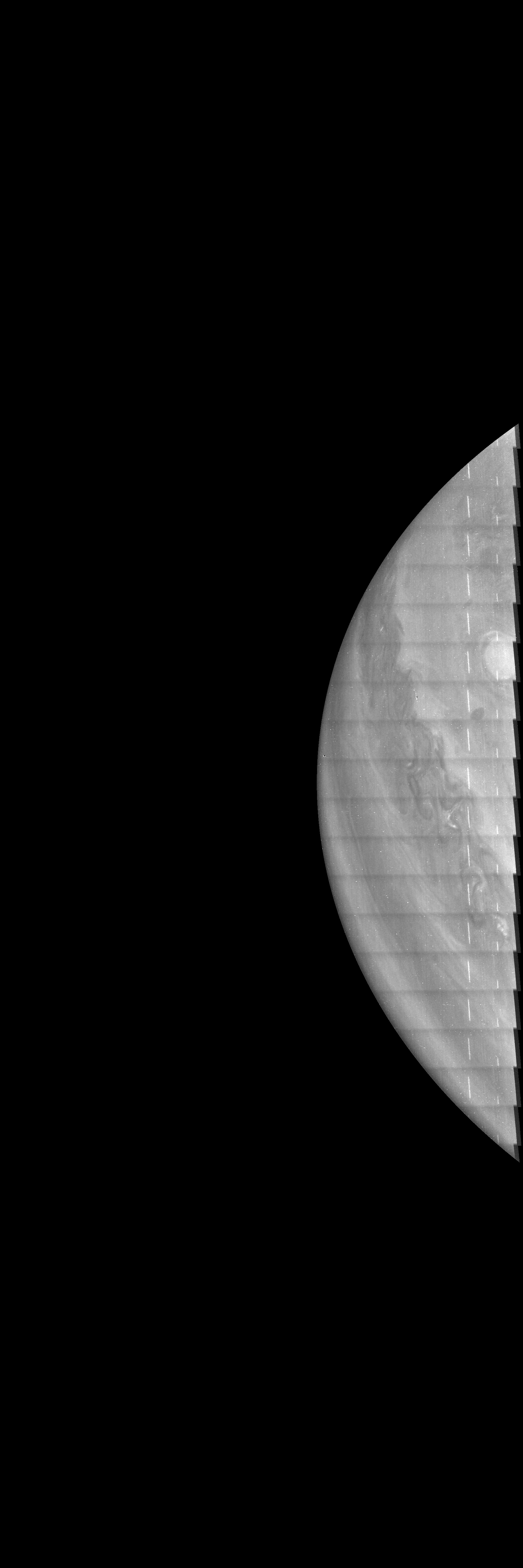 This methane-band image is reprojected according to a preliminary geometrical camera model, cleaned from some of the camera artifacts and energetic particle hits, approximately illumination adjusted with a 3rd degree polynomial BRDF over the cosines of the incidence and emission angle on the basis of PJ50 images, and displayed with gamma=1 with respect to the square root of radiometric values.