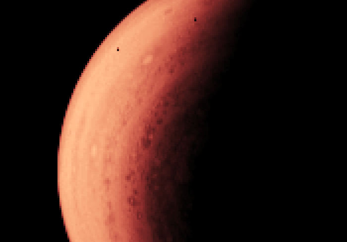 This is a false-color image of Jupiter created from the PJ70 Marble movie outbound raw image frames. You are able to see several storm systems and what I think are shadows of moons. I used JS9-4L software to edit this.