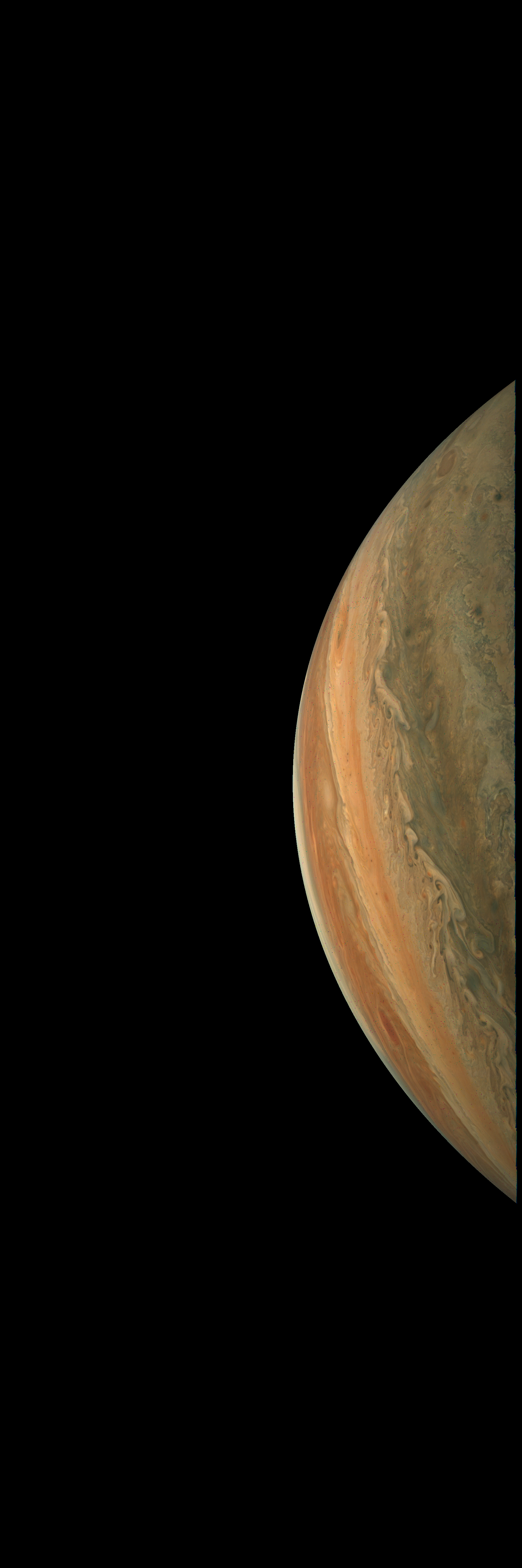 Resolution is 30 pixels per degrees in an equidistant cylindrical system centered to the camera at image stop time, with an axis parallel to Juno's spin axis. The rendered field of view is 60x180 degrees.