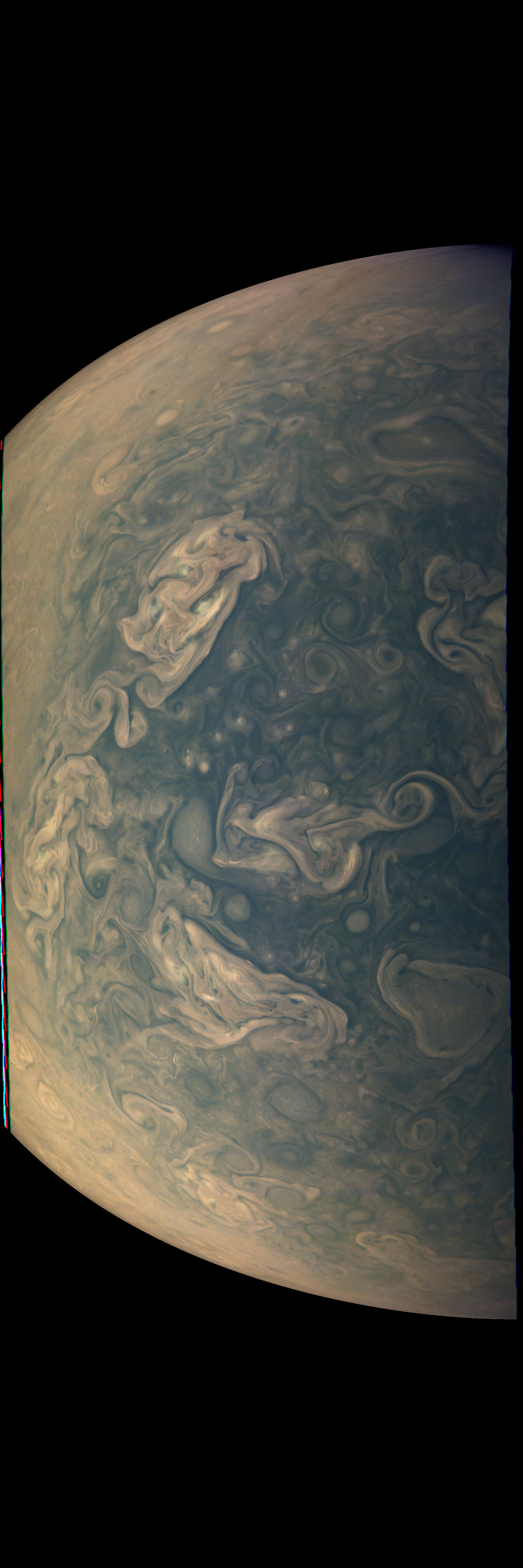 Junocam pixels are 12 bits deep from the camera but are converted to 8 bits inside the instrument using a lossless "companding" table, a process similar to gamma correction, to reduce their size. All Junocam products on the missionjuno website are in this 8-bit form as received on Earth. Scientific users interested in radiometric analysis should use the "RDR" data products archived with the Planetary Data System, which have been converted back to a linear 12-bit scale.