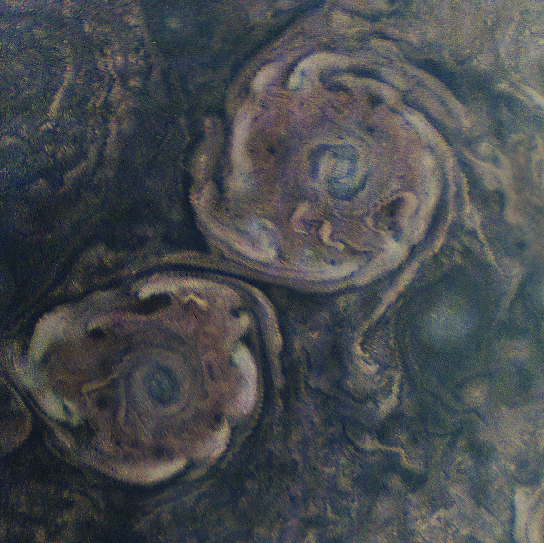 This pattern may be linked to wave activity and shear instabilities around the vortices (interpretive; imaging/processing may enhance the effect).