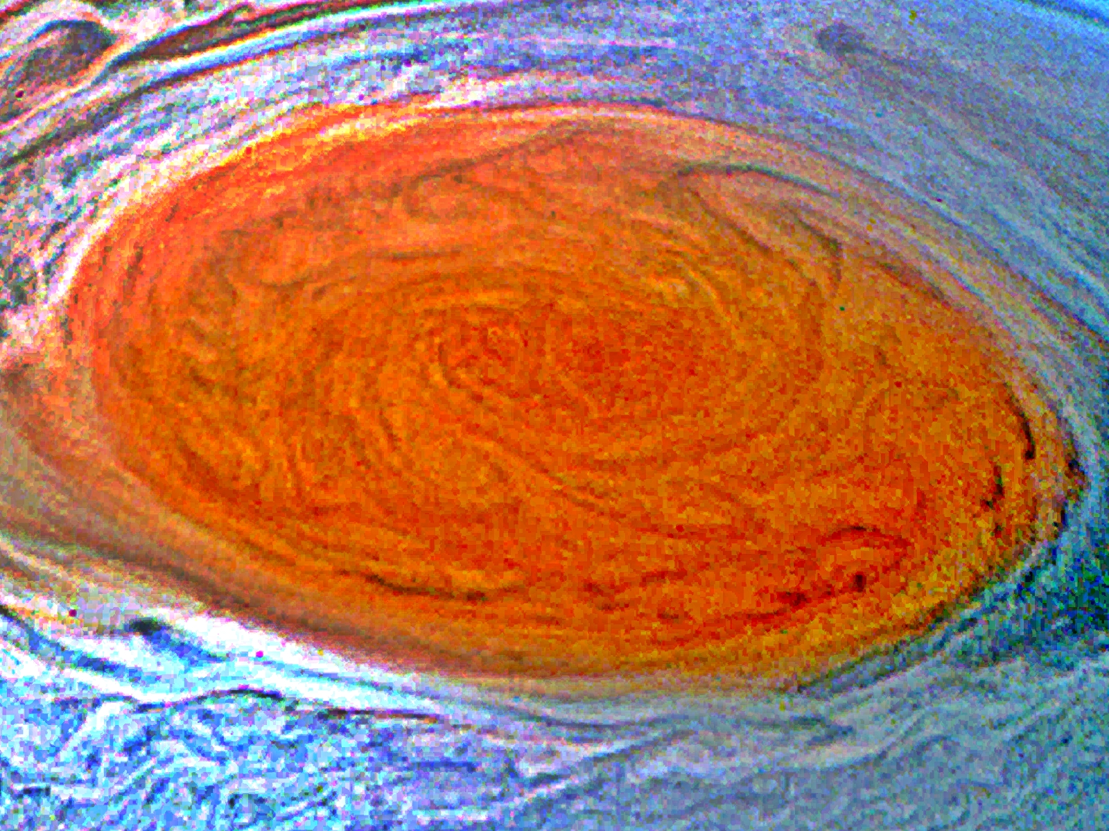 Junocam pixels are 12 bits deep from the camera but are converted to 8 bits inside the instrument using a lossless "companding" table, a process similar to gamma correction, to reduce their size. All Junocam products on the missionjuno website are in this 8-bit form as received on Earth. Scientific users interested in radiometric analysis should use the "RDR" data products archived with the Planetary Data System, which have been converted back to a linear 12-bit scale.