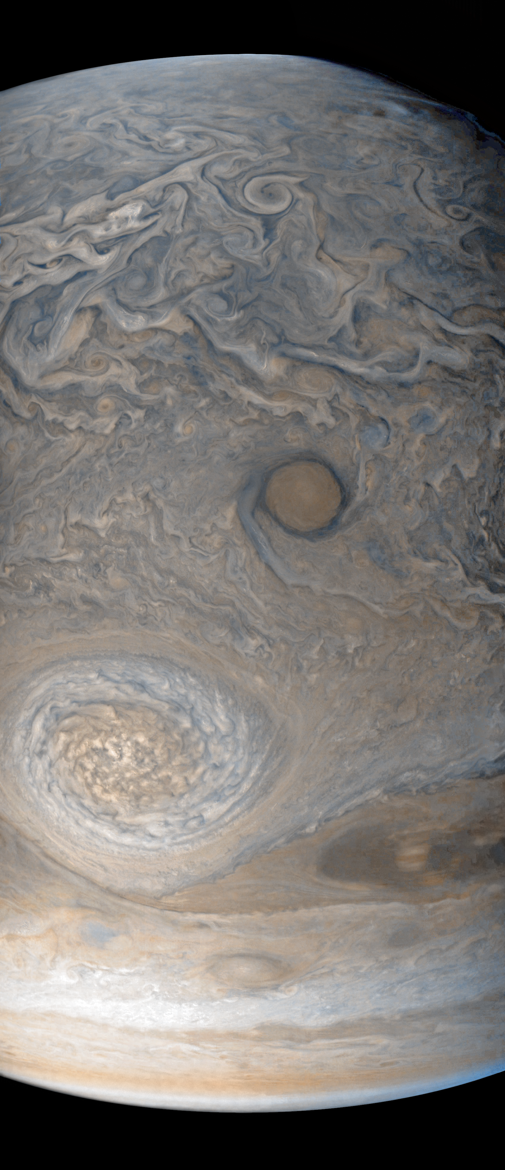 Processed version of Perijove 7 image #053, taken 11400 km over Jupiter's northern hemisphere. This image has been moderately contrast enhanced and white balanced. "Juno's Eye" (a red cyclonic system) and a large white oval with convective features dominate this scene, at the southern edge of the North Polar Hood.