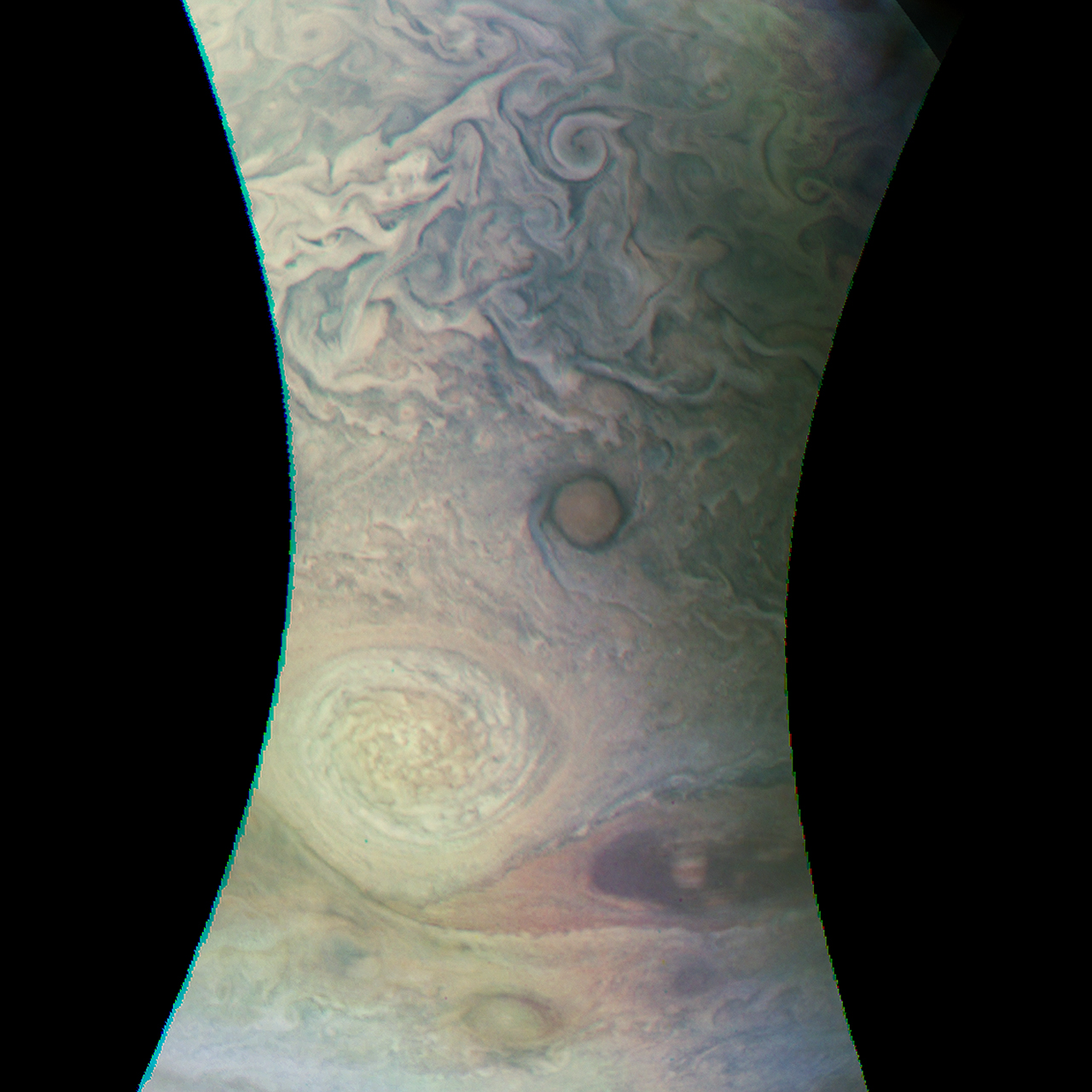 Junocam pixels are 12 bits deep from the camera but are converted to 8 bits inside the instrument using a lossless "companding" table, a process similar to gamma correction, to reduce their size. All Junocam products on the missionjuno website are in this 8-bit form as received on Earth. Scientific users interested in radiometric analysis should use the "RDR" data products archived with the Planetary Data System, which have been converted back to a linear 12-bit scale.