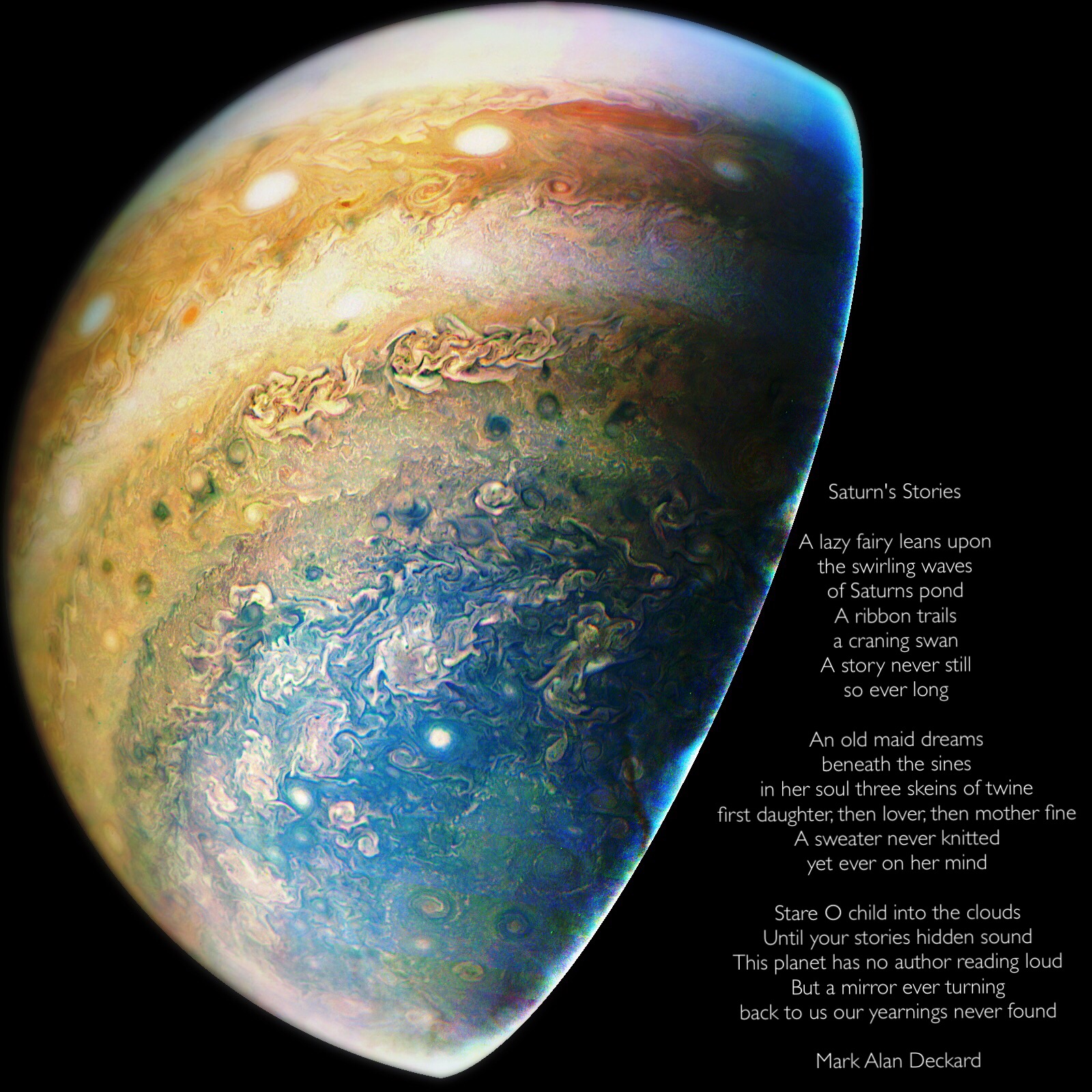 Can the clouds of a distant planet draw from our imagination deeper insights into ourselves. Saturns pristine swirls may be the perfect celestial Rorshach test