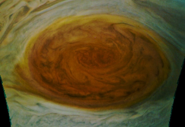 Contrasted to bring out the air current and cloud patterns within the Great Red Spot