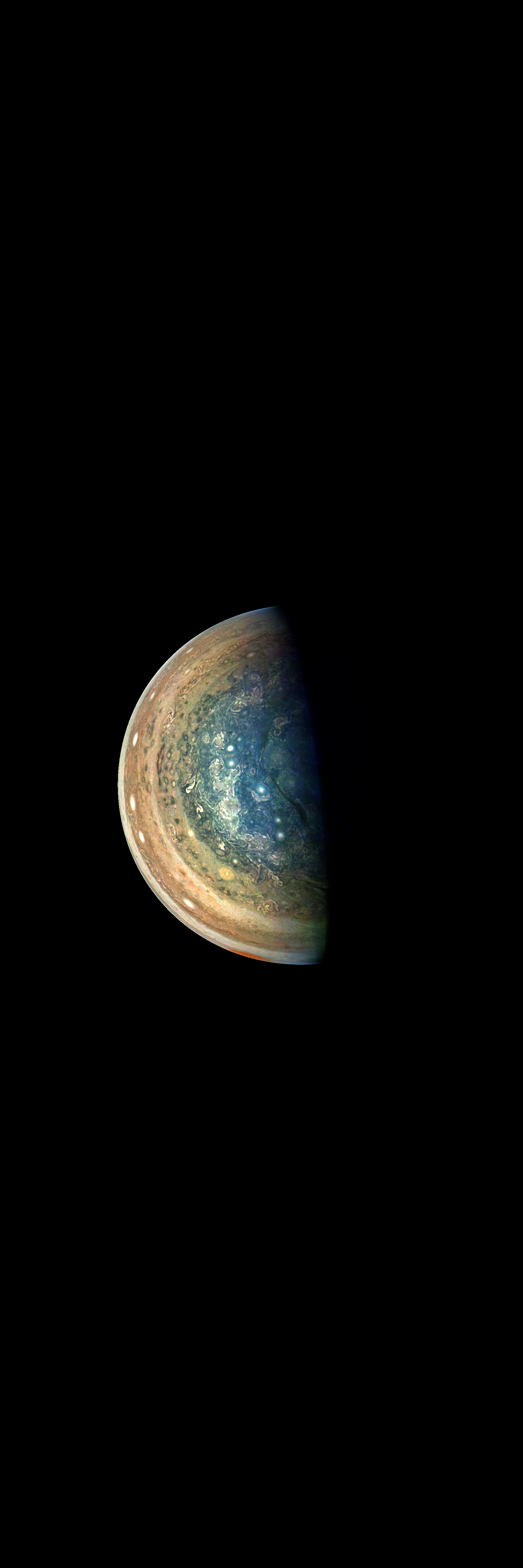 This image has been taken during Juno's Perijove-10 Jupiter flyby. It is rendered directly from the raw in one monolithitic step, except file format conversions.