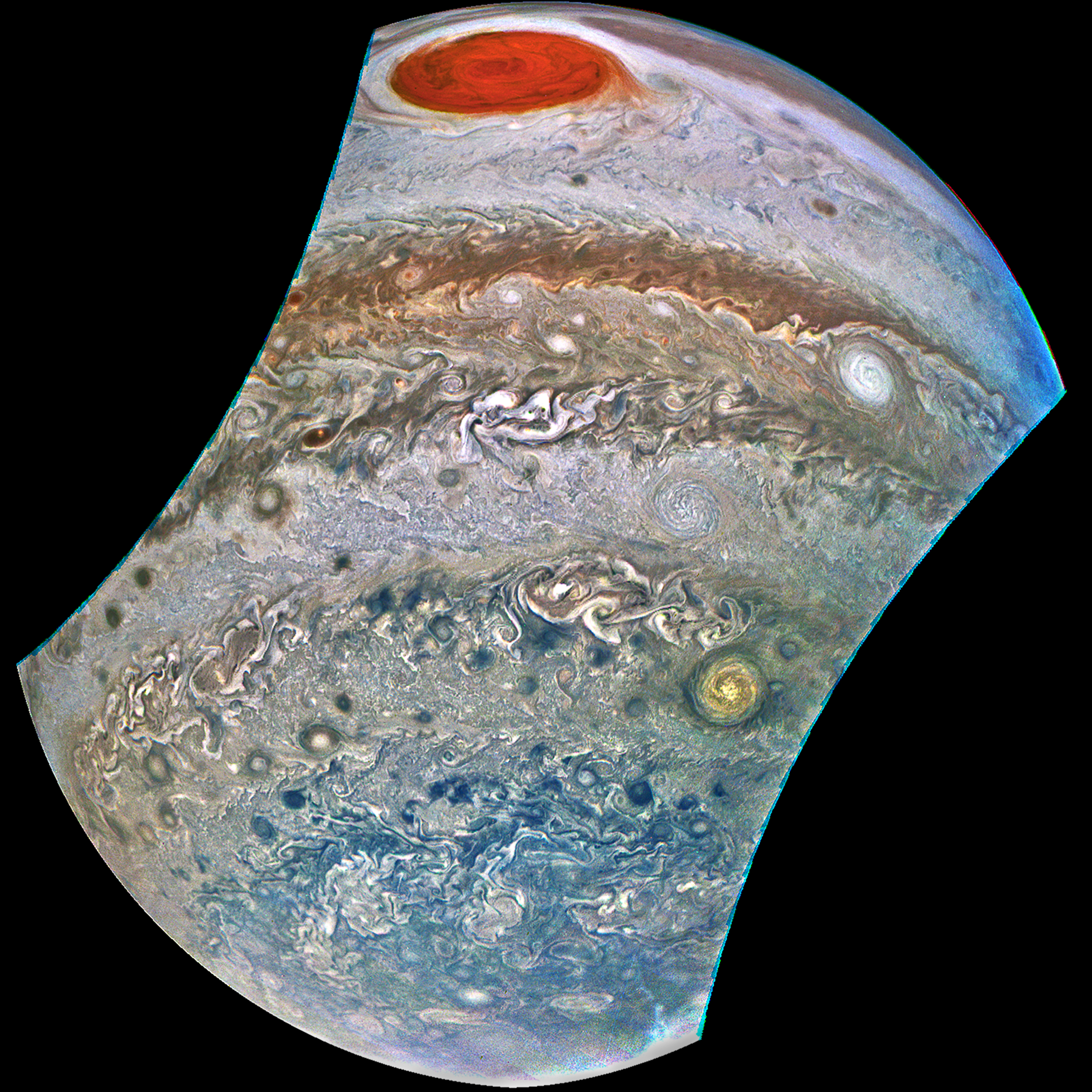 South side view shows the Great Red Spot and other turbulence.