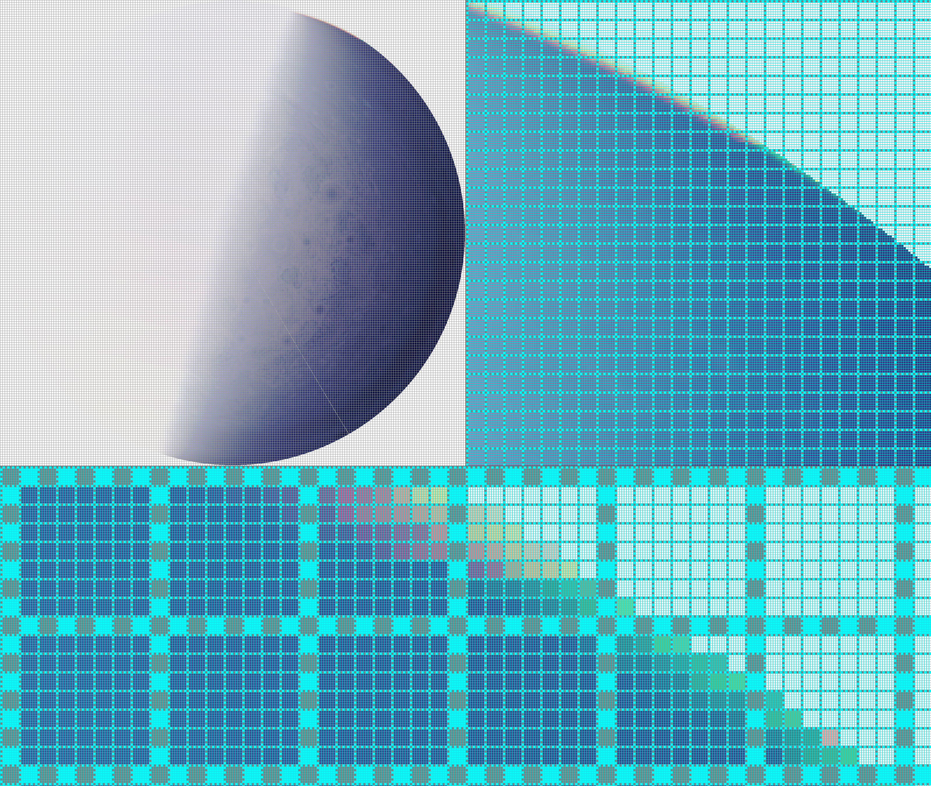 Digital Art Color Experiment. 'South pole at minimum emission angle' processed on Windows and Windows Paint. Processes: Windows Paint Grid at zoom x8 was 'Print Screened' and applied at the front of the image. Than a random area from the image is zoomed at x8; a command Grid is applied; command 'Print Screen' and than the image area is Cropped. Than a random area from the zoom x8 Cropped image is zoomed at x8; a command Grid is applied again; command 'Print Screen' and than the image area is Cropped. Inverted Colors. Monochrome. Colored [the colors from the Juno on-line Game were used]; Inverted Colors.