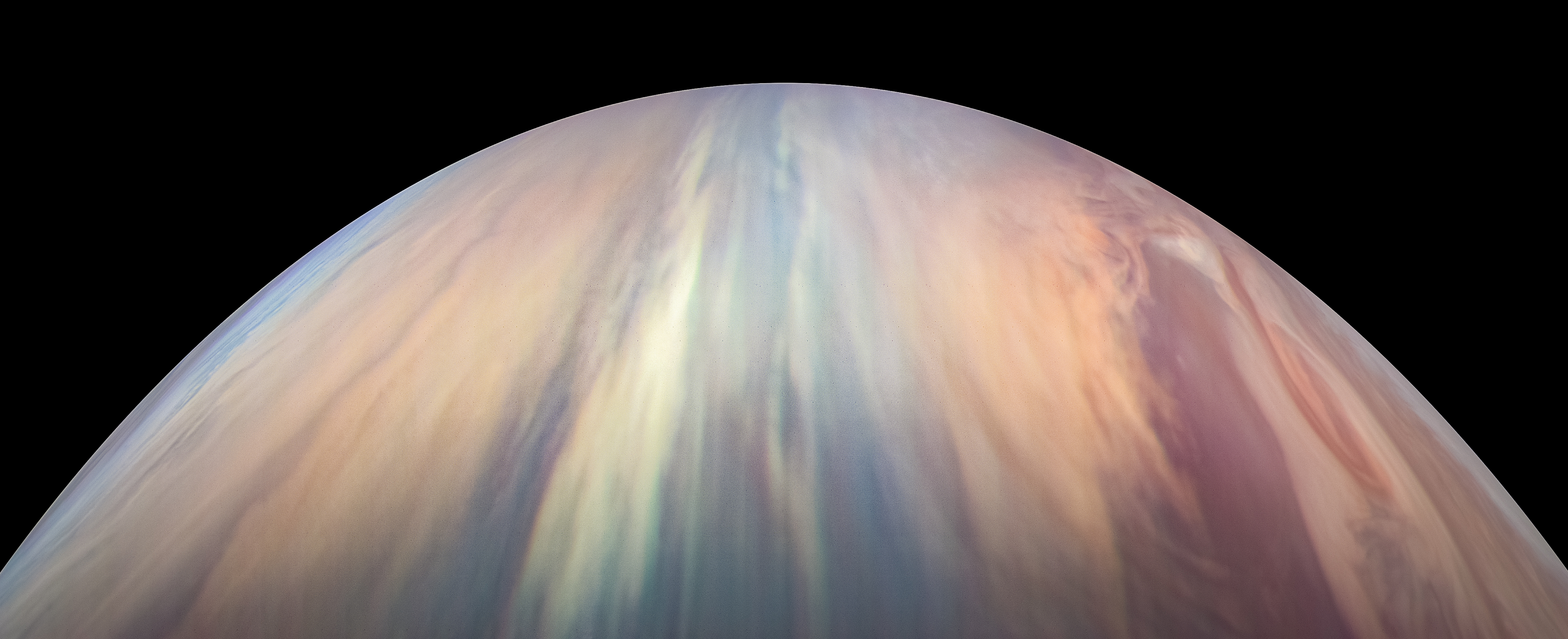 Junocam pixels are 12 bits deep from the camera but are converted to 8 bits inside the instrument using a lossless "companding" table, a process similar to gamma correction, to reduce their size. All Junocam products on the missionjuno website are in this 8-bit form as received on Earth. Scientific users interested in radiometric analysis should use the "RDR" data products archived with the Planetary Data System, which have been converted back to a linear 12-bit scale.