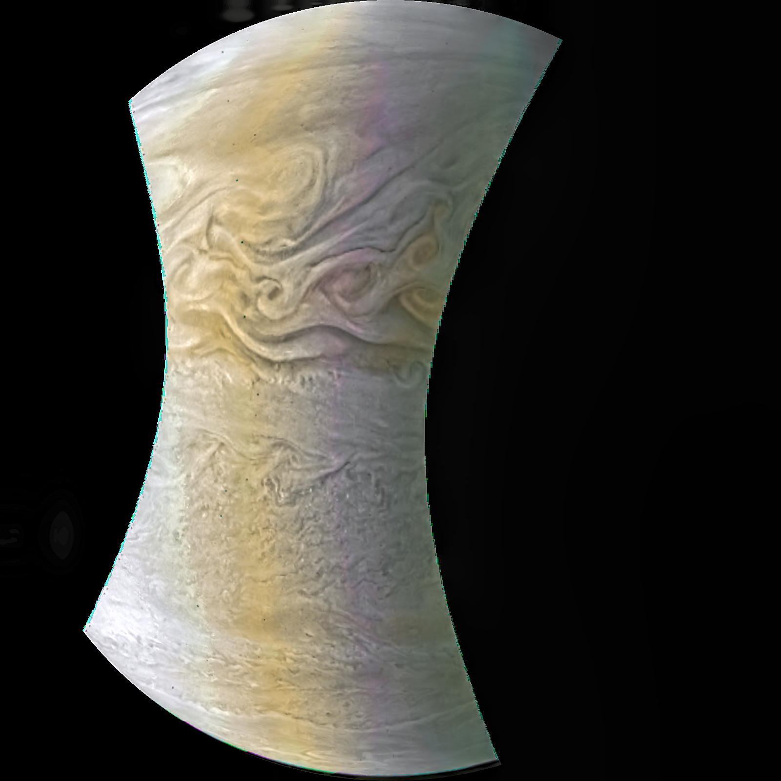Junocam pixels are 12 bits deep from the camera but are converted to 8 bits inside the instrument using a lossless "companding" table, a process similar to gamma correction, to reduce their size. All Junocam products on the missionjuno website are in this 8-bit form as received on Earth. Scientific users interested in radiometric analysis should use the "RDR" data products archived with the Planetary Data System, which have been converted back to a linear 12-bit scale.