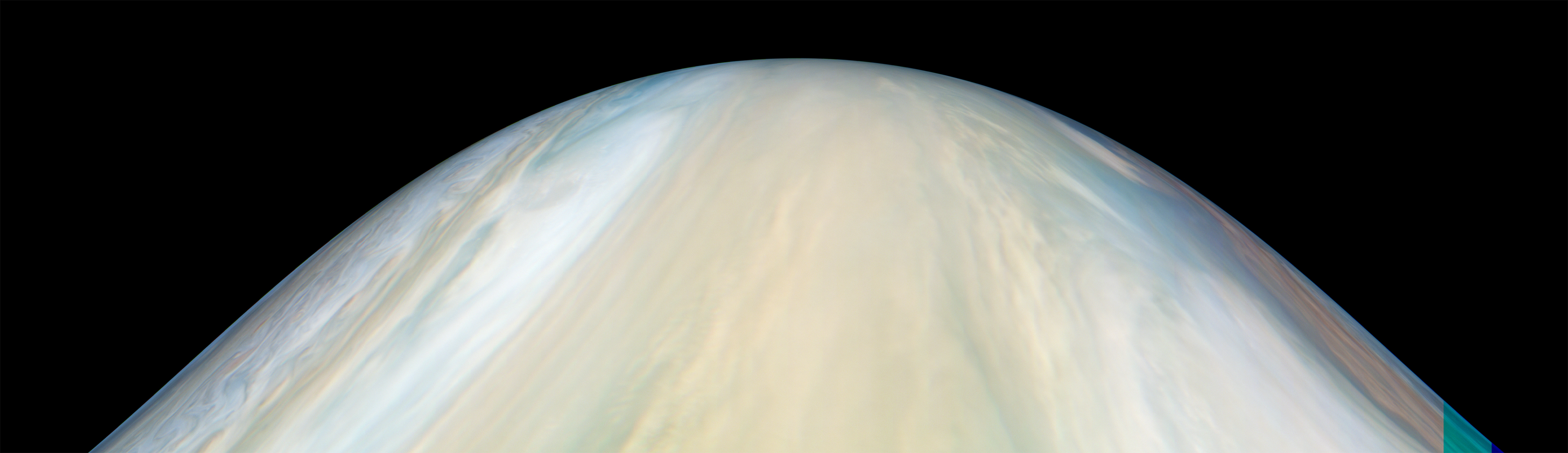 Junocam pixels are 12 bits deep from the camera but are converted to 8 bits inside the instrument using a lossless "companding" table, a process similar to gamma correction, to reduce their size. All Junocam products on the missionjuno website are in this 8-bit form as received on Earth. Scientific users interested in radiometric analysis should use the "RDR" data products archived with the Planetary Data System, which have been converted back to a linear 12-bit scale.