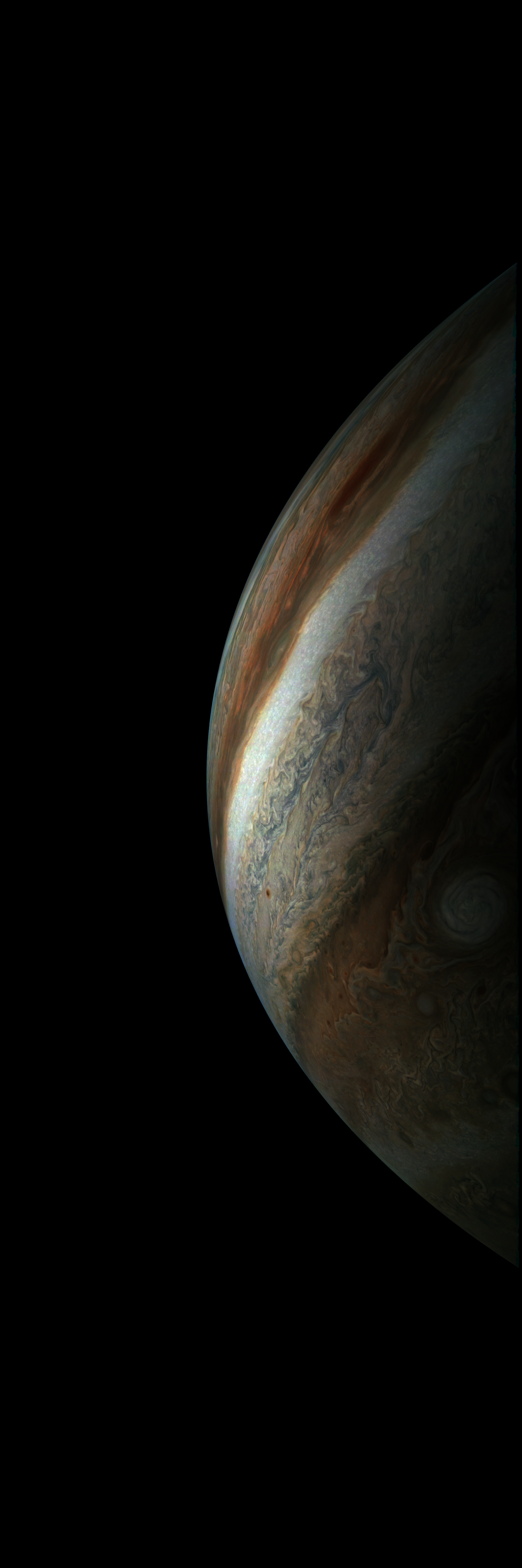 Resolution is 30 pixels per degrees in an equdistant cylindrical system centered to the camera at image stop time, with an axis parallel to Juno's spin axis. The rendered field of view is 60x180 degrees.