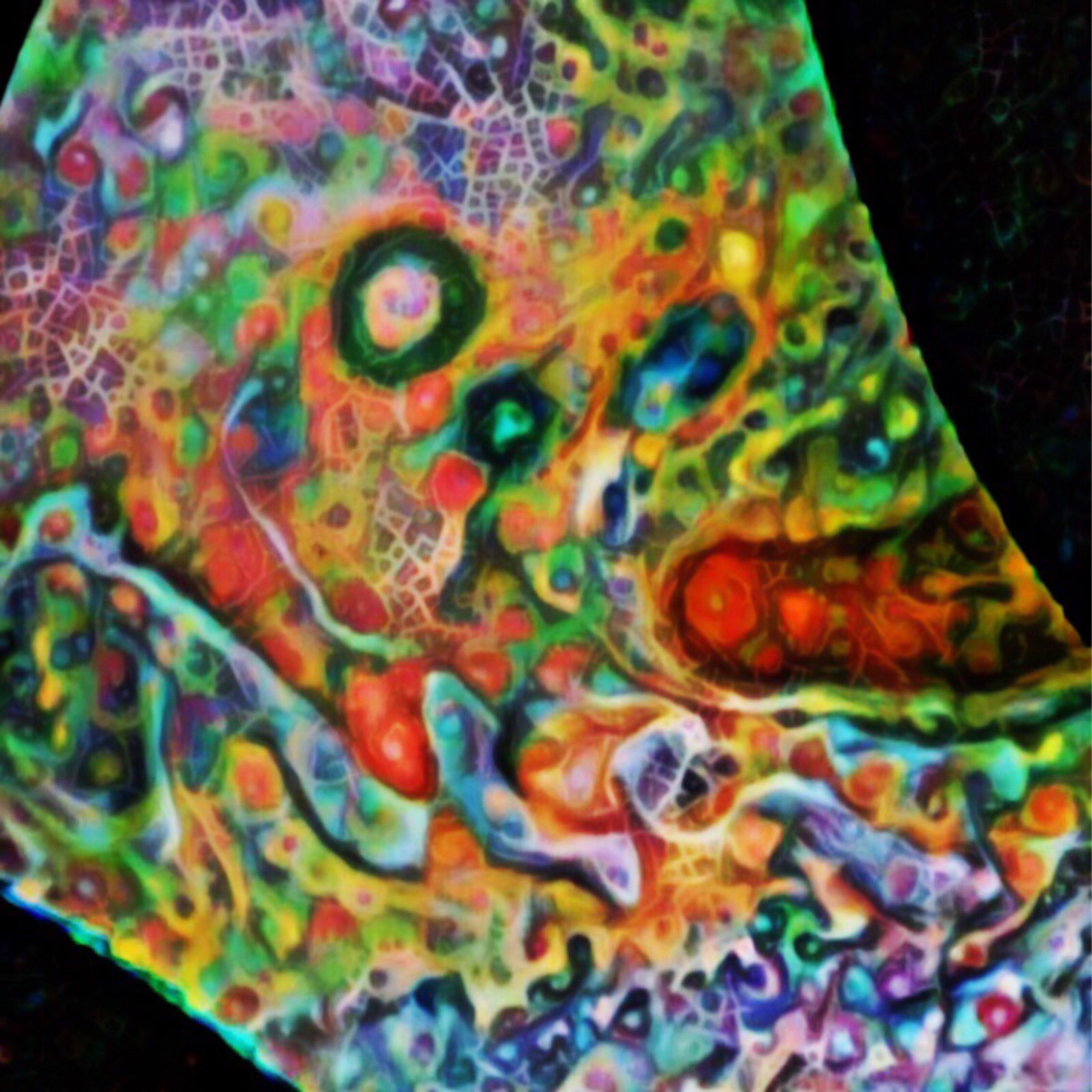 Detail of colour enhanced image with multiple overlaid "AI mediated" abstract filters