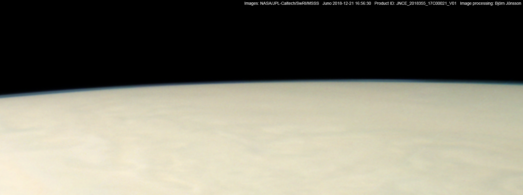 An approximately true color/contrast image showing details from perijove 17 image number 21. Compared to the original data this image has been enlarged by a factor of 3 to show Jupiter's limb more clearly. The brightness of the haze and blue sky at the limb has also been increased slightly relative to the brightest parts of the image. This reveals that the amount of haze is variable, relatively small near the center and larger to the right and also near the left edge of the image.