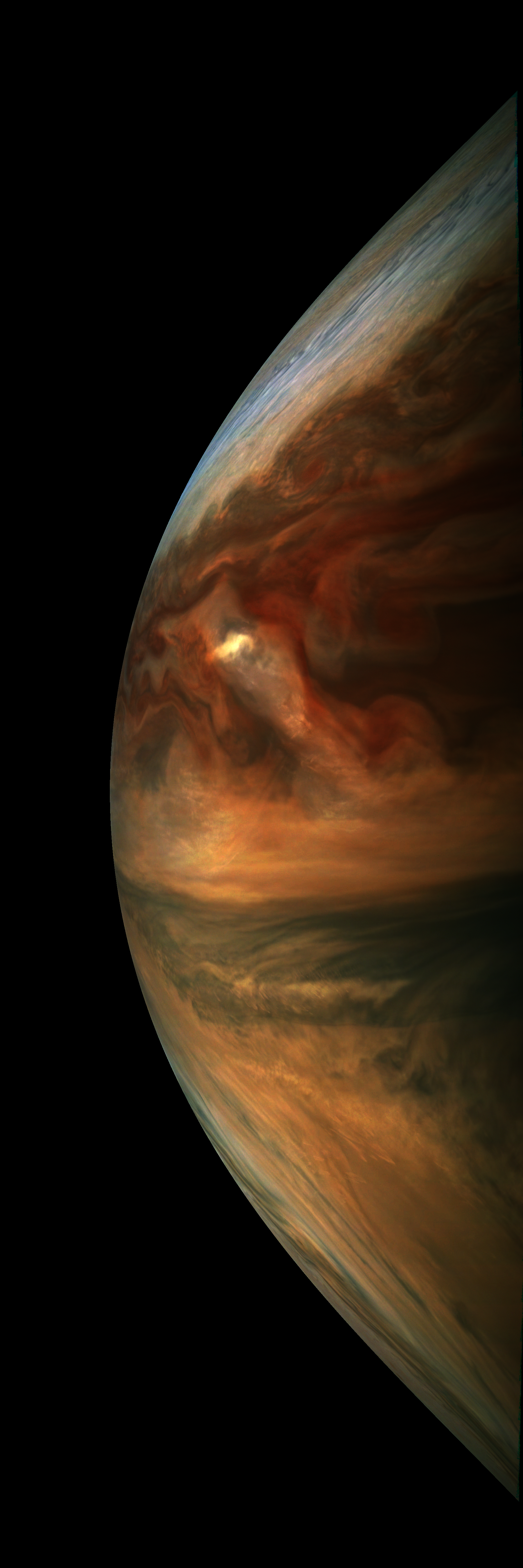 Resolution is 30 pixels per degrees in an equidistant cylindrical system centered to the camera at image stop time, with an axis parallel to Juno's spin axis. The rendered field of view is 60x180 degrees.