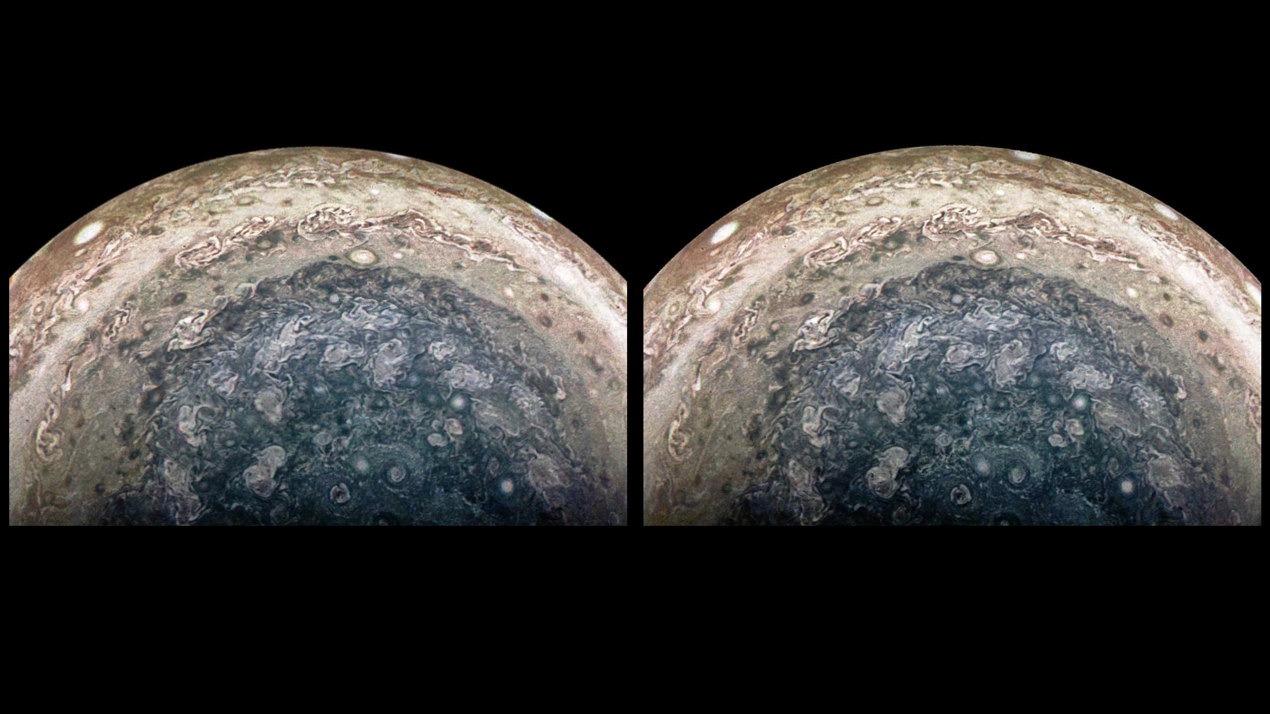This is an actual stereograph, not an artificial 3D conversion made from a single 2D image. The 6-minute 3.8-second interval between two JunoCam images taken during the time lapse sequence of Perijove 6 (19 May 2017 at 07:19:15.885 and 07:25:19.693 UTC) established a stereo base (camera separation) of thousands of kilometers, from which this stereographic image pair was crafted using Photoshop. Thanks to the velocity of Juno, the distance traveled during the interval between these two captures effectively gives our eyes that same separation. Viewing Jupiter at a known average altitude of 123,288.25 km (76,607.6 miles), it's nevertheless possible to perceive features of the atmosphere three dimensionally. Juno's actual speed and, thus, the stereo base for this image pair from Perijove 6, is unknown (at least to the creator of this stereograph). Note that during the 6-minute 3.8-second interval, Juno ascended 10,140.1 km (6,300.8 miles), from 118,218.2 km to 128,358.3 km (an 8.58% gain in altitude), requiring z-axis correction in addition to x- and y-axis skewing, to produce the stereograph. Note: Retinal rivaly reveals the motion of a small orange moon that can be seen in the light-colored band, along a radial at roughly 10 O'clock relative to the pole. It moved a considerable distance during the 6-minute interval between exposures.