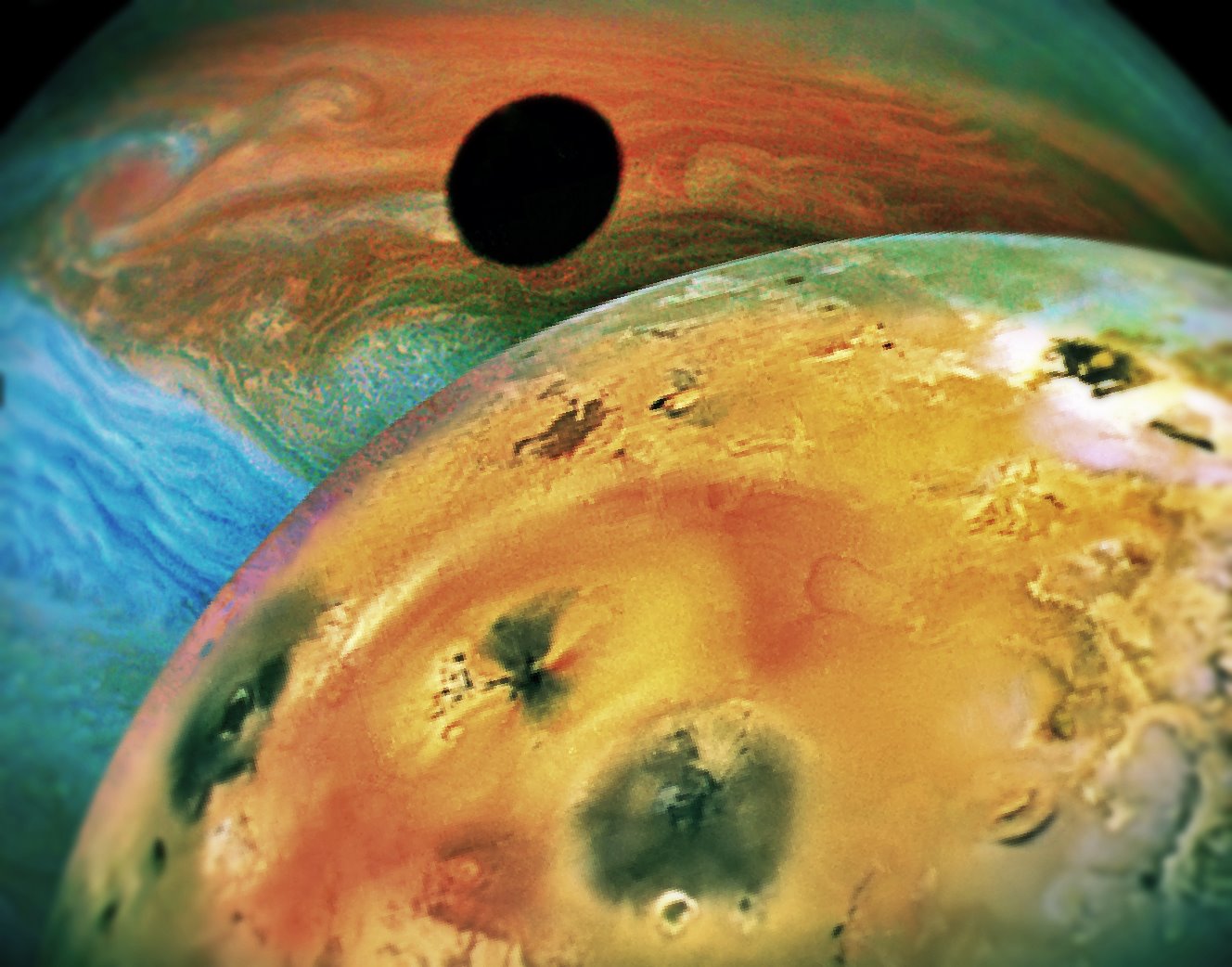 Composite picture of Io and Jupiter with Io's shadow