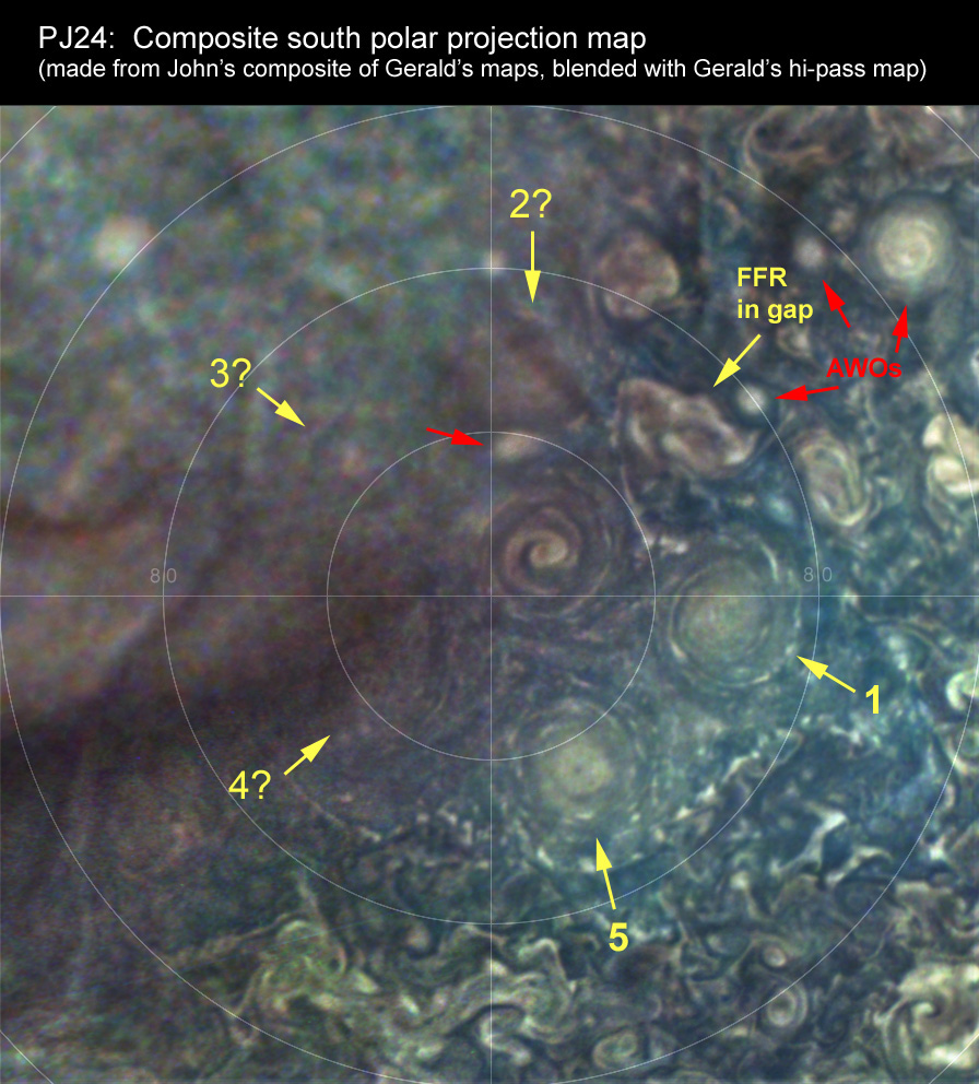 This is a composite south polar projection map of the circumpolar cyclones (CPCs), made by combining Gerald Eichstädt's single-image maps, taken over several hours as Juno departed. The altitude of Juno's passes over the southern latitudes is increasing with each orbit, so the resolution of the later-imaged sector of the map is reduced, but we can clearly see the location of greates interest -- the former gap between CPCs-1 & 2. At PJ23 it was occupied by a compact dark cyclone, apparently turning the cluster into a hexagon, but this was smaller than the five long-established CPCs and might have drifted in randomly. At PJ24, this cyclone is absent, but instead the former gap is filled by a larger, irregular cyclonic structure (a FFR). Watch this space! This is one figure from our full report on PJ24, now being posted on the Think Tank pages, and on the BAA Jupiter Section web site.