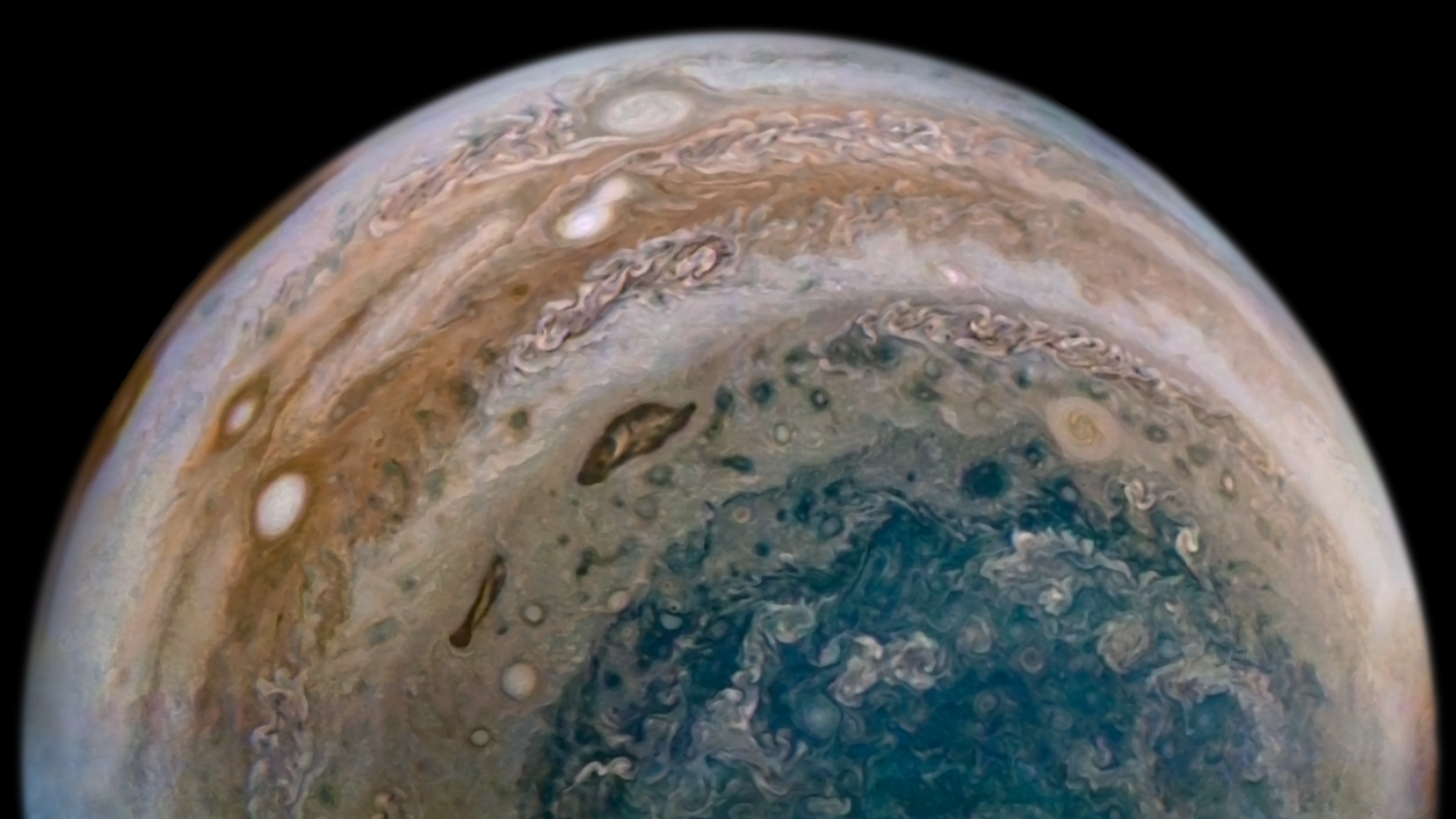 Processed using the JunoCam imager's PJ24 South Polar Timelapse Sequence raw images and data from NASA's Juno spacecraft flyby on December 26, 2019. Enhanced to highlight features, clouds, colours, and the beauty of Jupiter. Artist's impression - not representative of true colour.