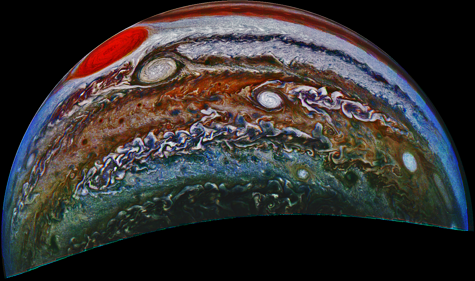 Junocam pixels are 12 bits deep from the camera but are converted to 8 bits inside the instrument using a lossless "companding" table, a process similar to gamma correction, to reduce their size. All Junocam products on the missionjuno website are in this 8-bit form as received on Earth. Scientific users interested in radiometric analysis should use the "RDR" data products archived with the Planetary Data System, which have been converted back to a linear 12-bit scale.