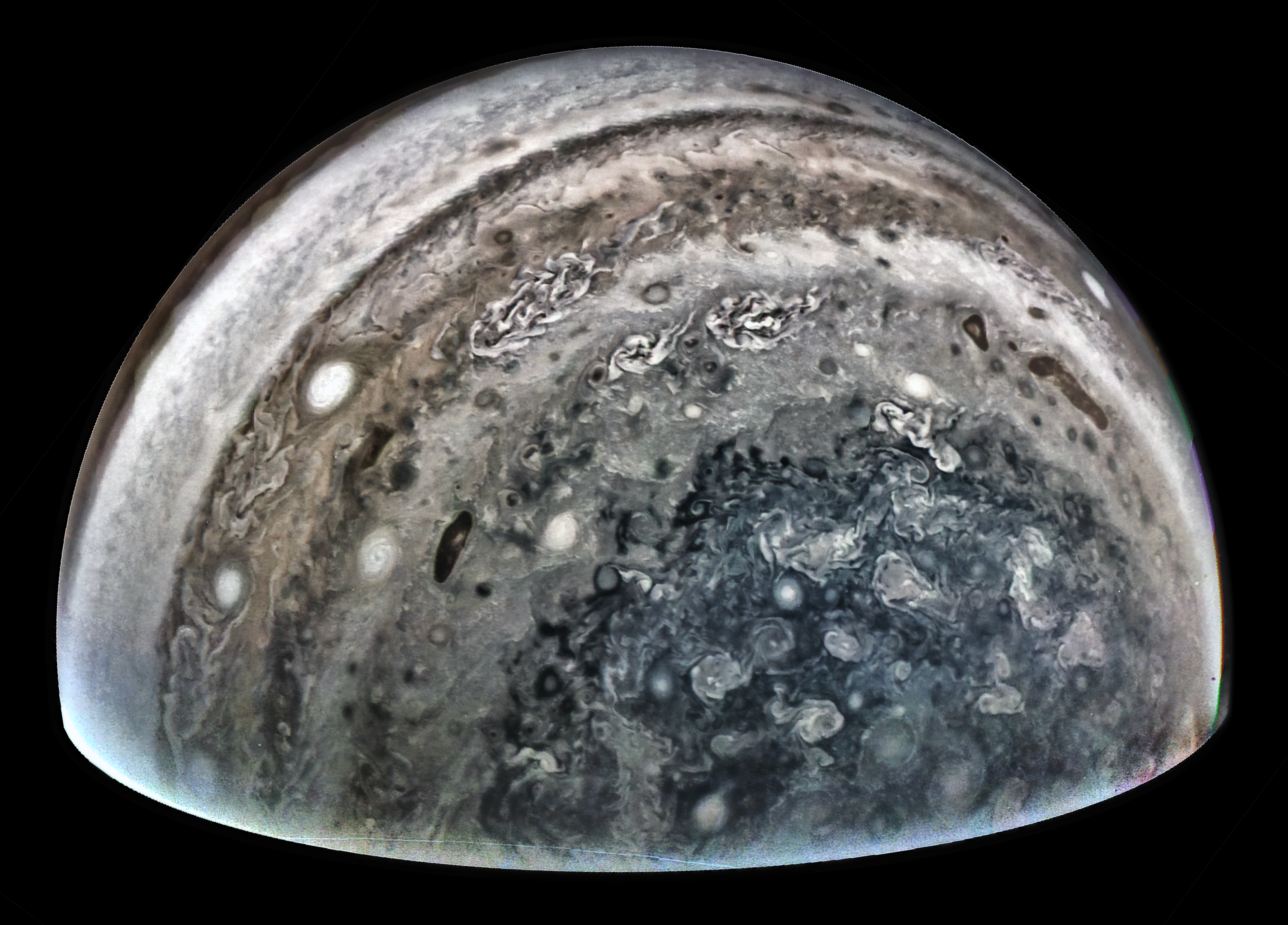 Junocam pixels are 12 bits deep from the camera but are converted to 8 bits inside the instrument using a lossless "companding" table, a process similar to gamma correction, to reduce their size. All Junocam products on the missionjuno website are in this 8-bit form as received on Earth. Scientific users interested in radiometric analysis should use the "RDR" data products archived with the Planetary Data System, which have been converted back to a linear 12-bit scale.