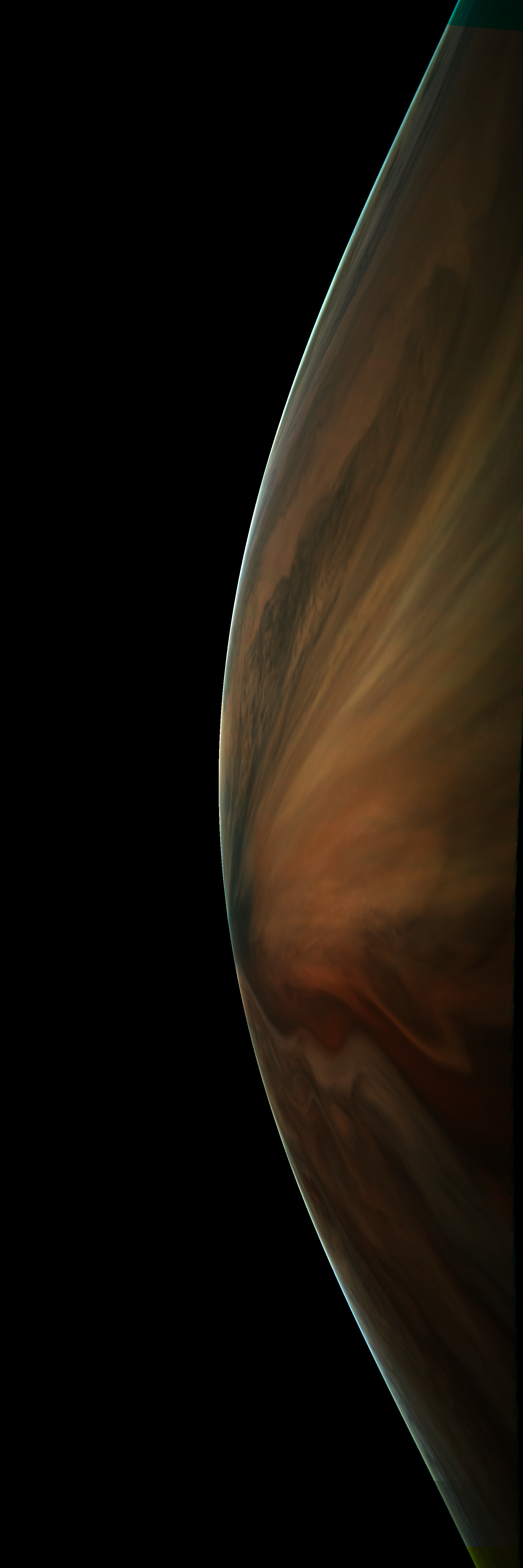 Resolution is 30 pixels per degrees in an equidistant cylindrical system centered to the camera at image stop time, with an axis parallel to Juno's spin axis. The rendered field of view is 60x180 degrees.