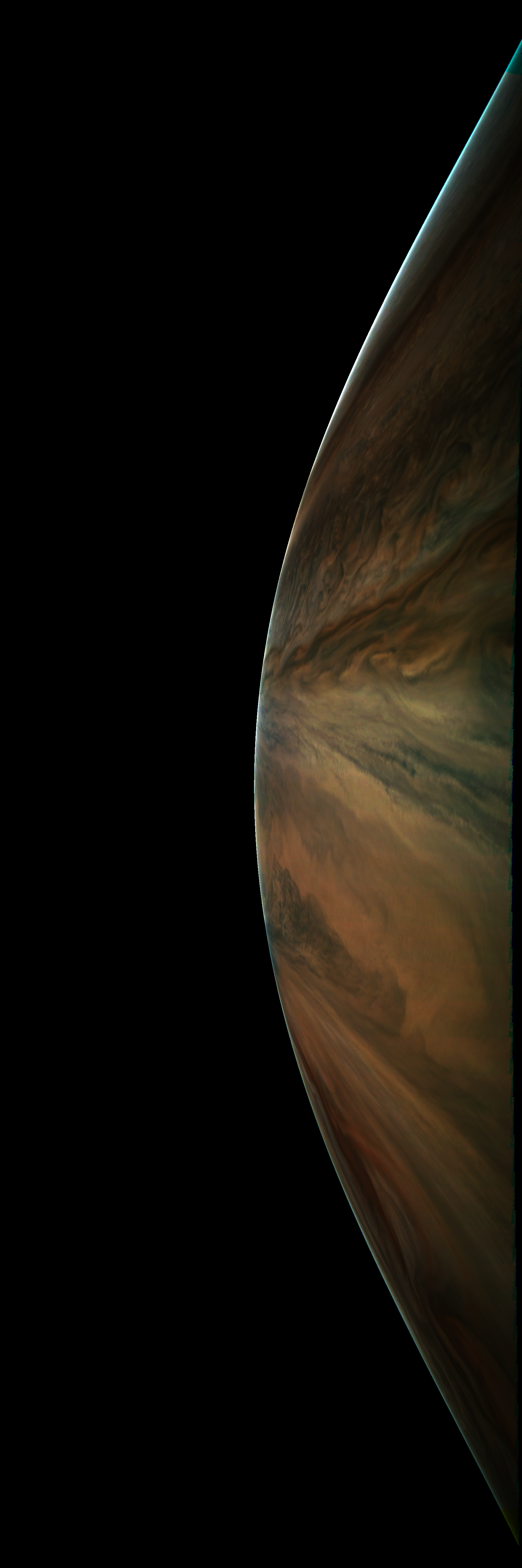 Resolution is 30 pixels per degrees in an equidistant cylindrical system centered to the camera at image stop time, with an axis parallel to Juno's spin axis. The rendered field of view is 60x180 degrees.